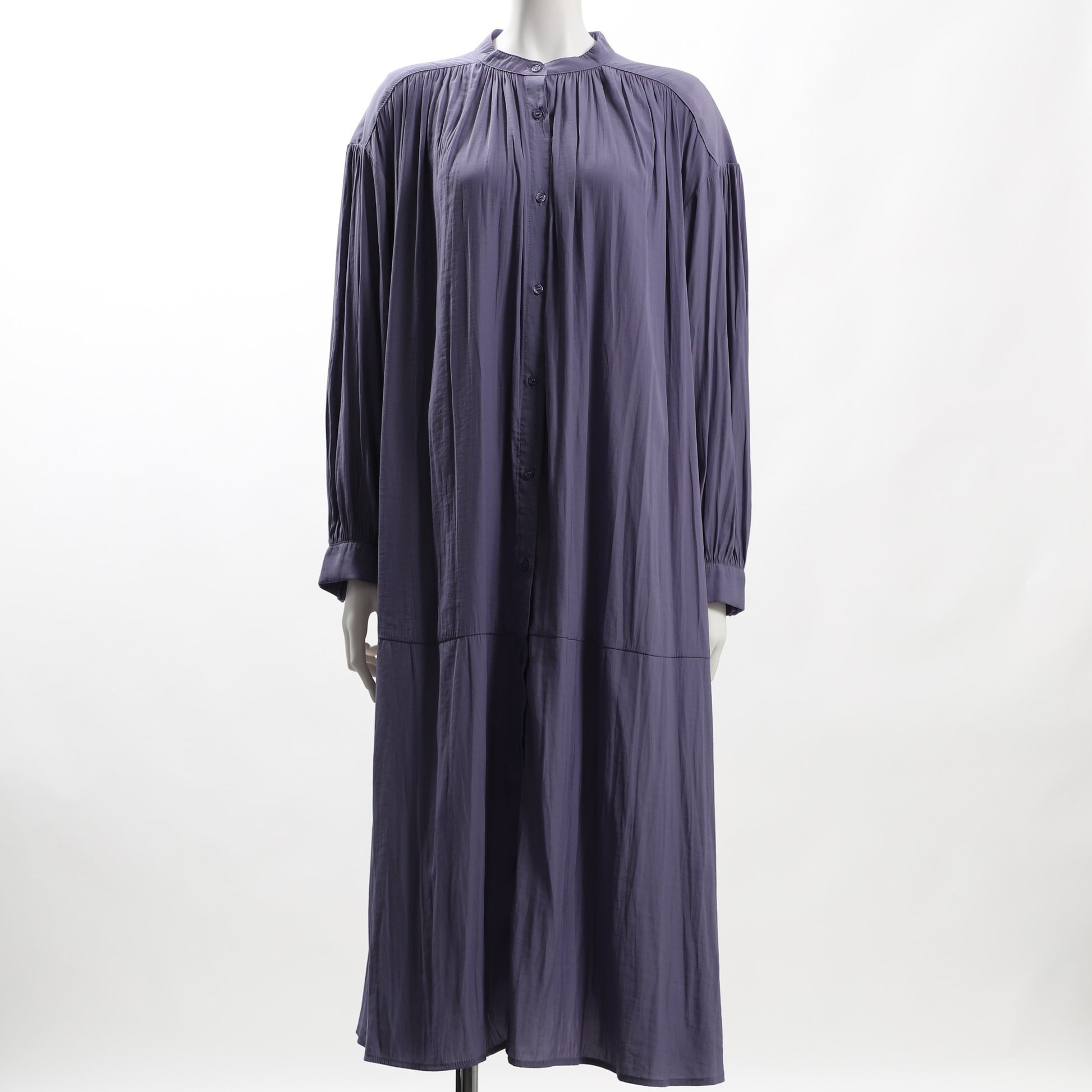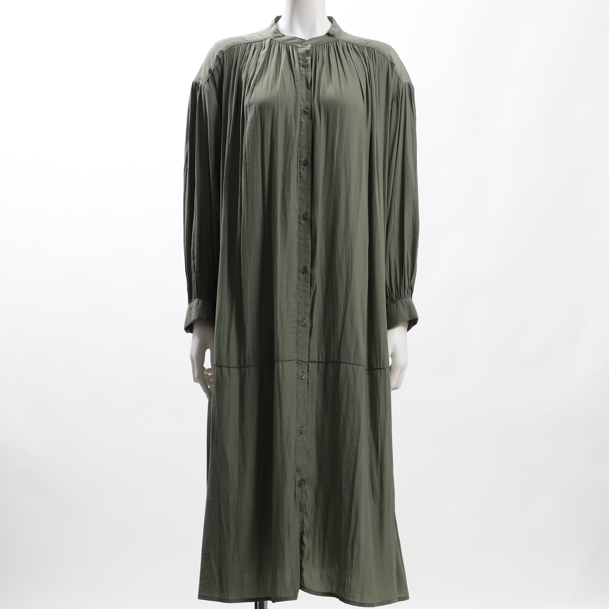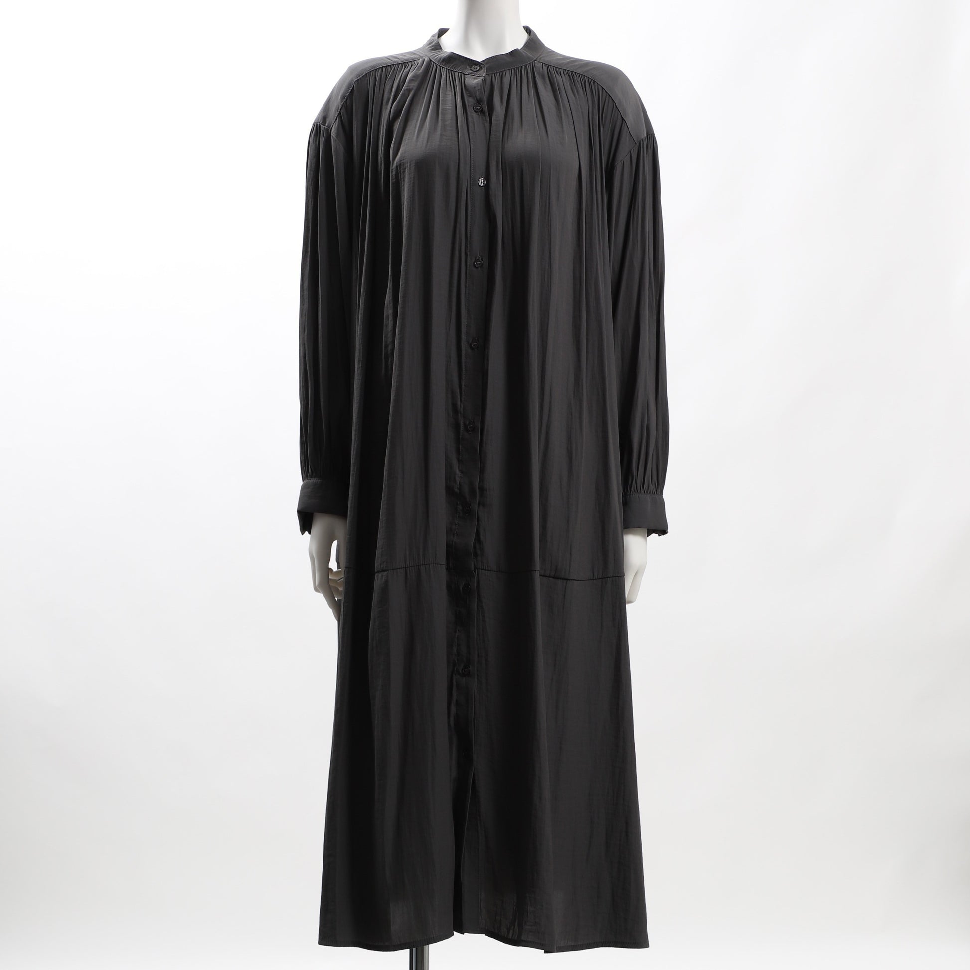 ゆったりめに着られるギャザードネックのバンドカラーワンピース。ポインテッドトゥパンプスを合わせてシャープさを出してもいいですし、バレエシューズを合わせて柔らかい雰囲気に仕上げるのもおすすめですよ。