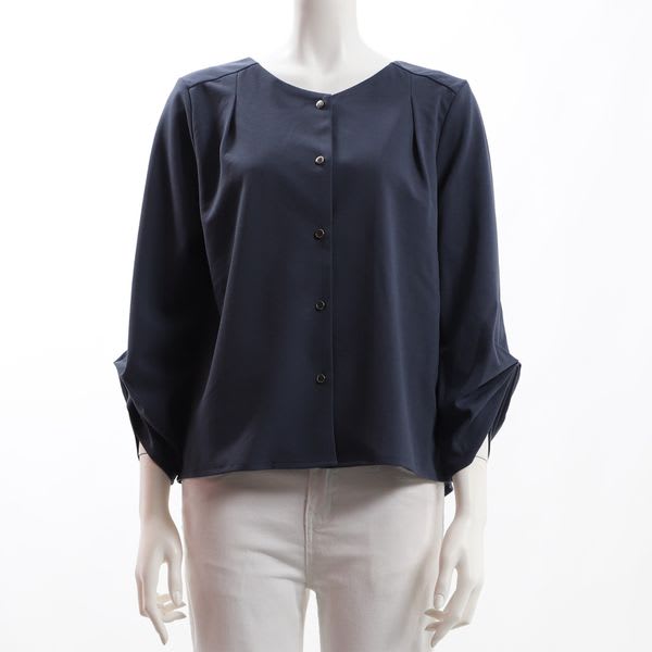袖のデザインが特徴的なフロントボタンブラウス。フレアスカートとラウンドパンプスを合わせて女性らしいスタイルに、デニムパンツとフラットシューズを合わせてカジュアルスタイルも素敵ですよ。