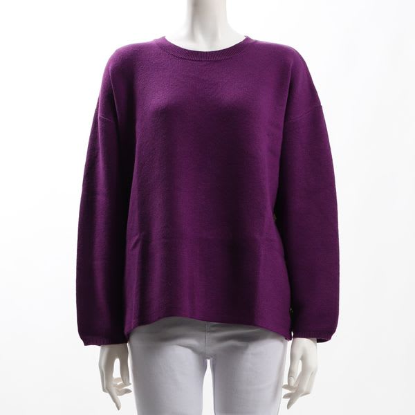 両サイドの並びボタンがポイントのデザインニット。丈の長めなシャツブラウスの裾を出すとおしゃれ上級者な着こなしに。チェック柄パンツとフラットシューズを合わせてカジュアルなスタイルや、タイトスカートとパンプスを合わせてキレイめスタイルも素敵ですよ。