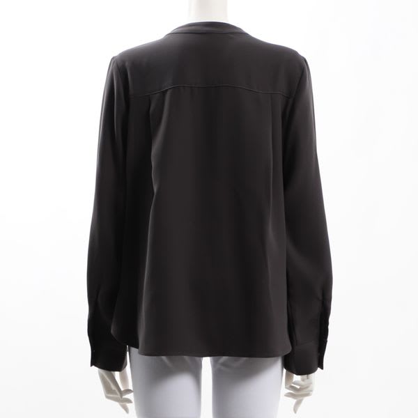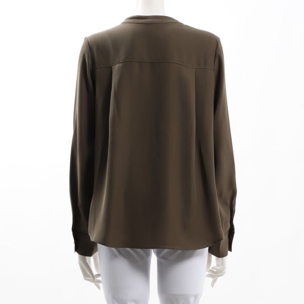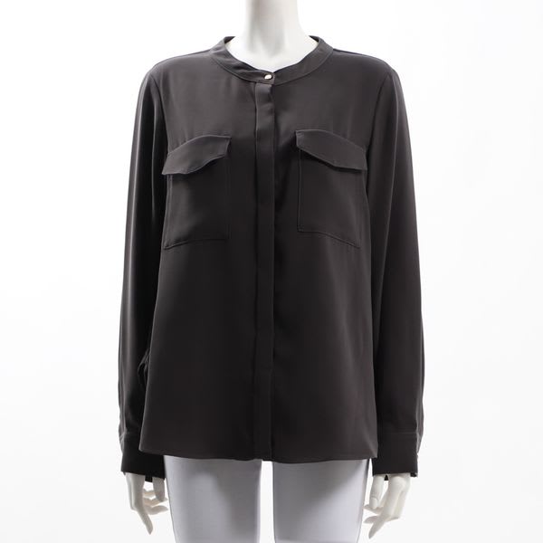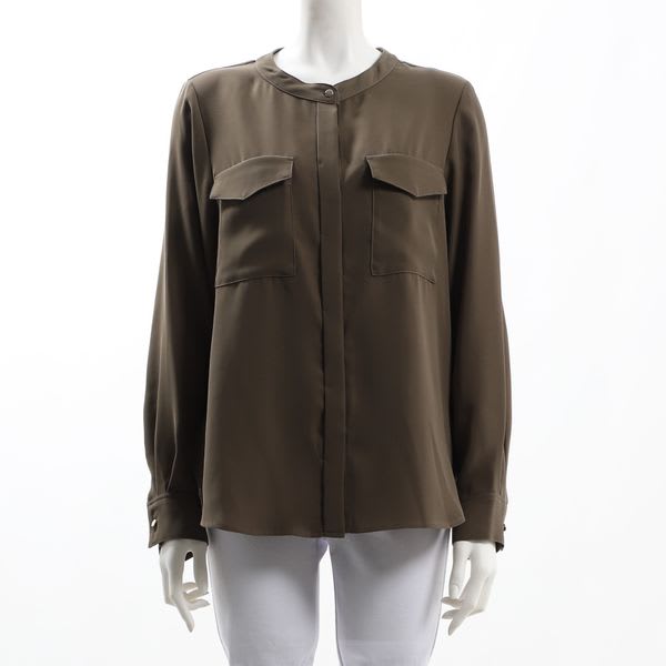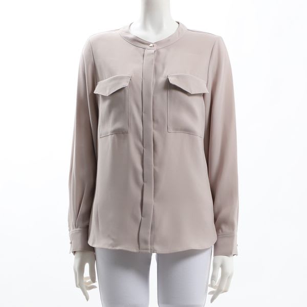 襟元のボタンやフラップポケットがアクセントのバンドカラーブラウス。ボトムスにはテーパードパンツを合わせてクールに、タイトスカートでレディライクに仕上げてもいいですね。