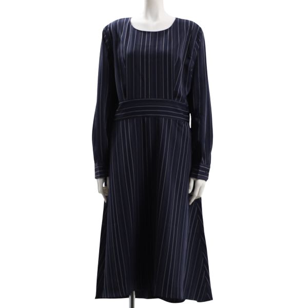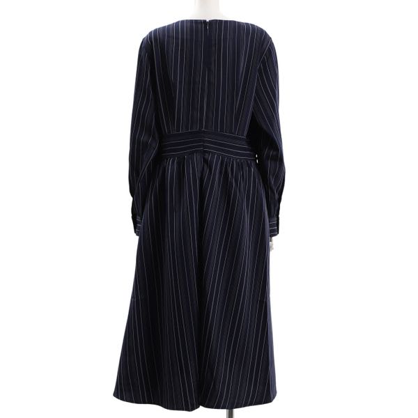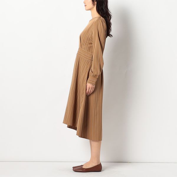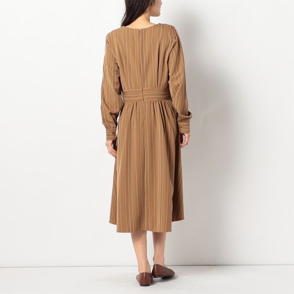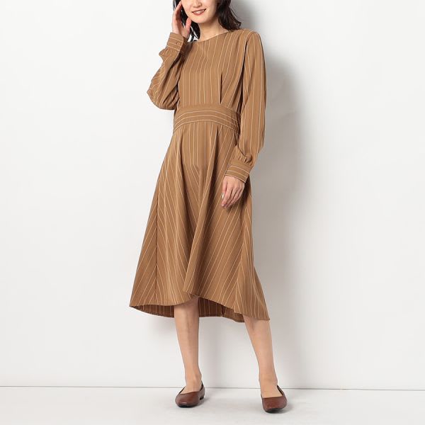 ストライプ柄のラウンドネックワンピースです。ノーカラーコートとパンプスを合わせてキレイめスタイルや、ダウンコートとフラットシューズを合わせてカジュアルなスタイルもいいですね。