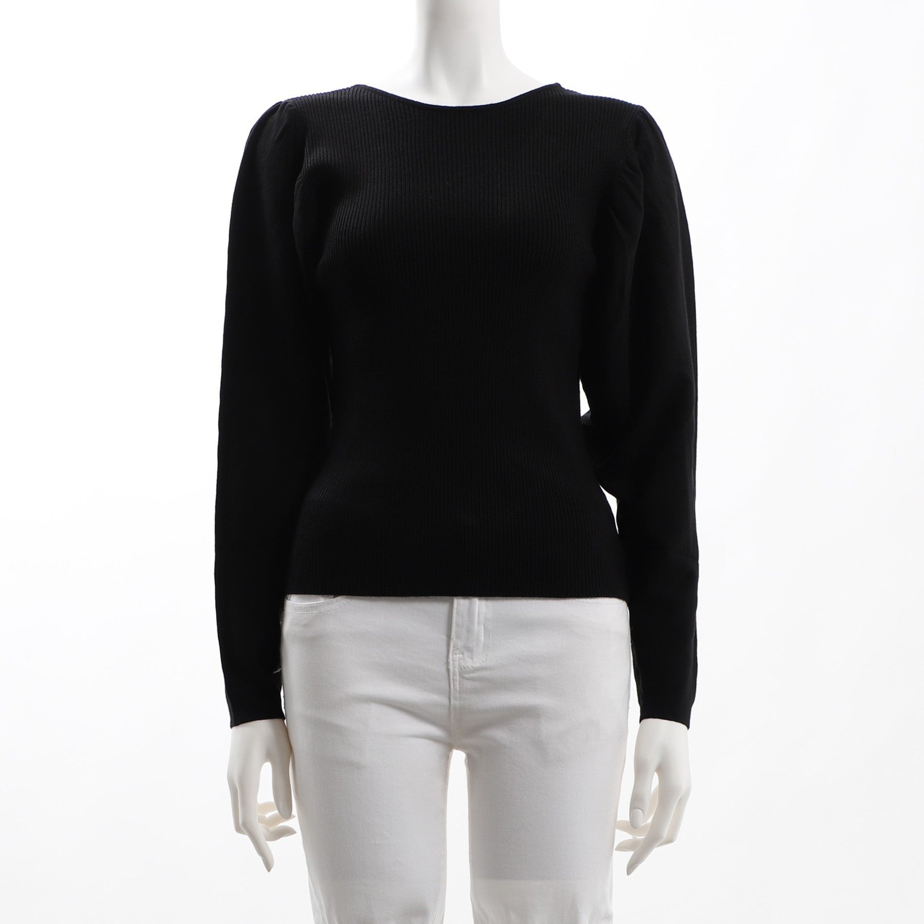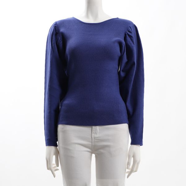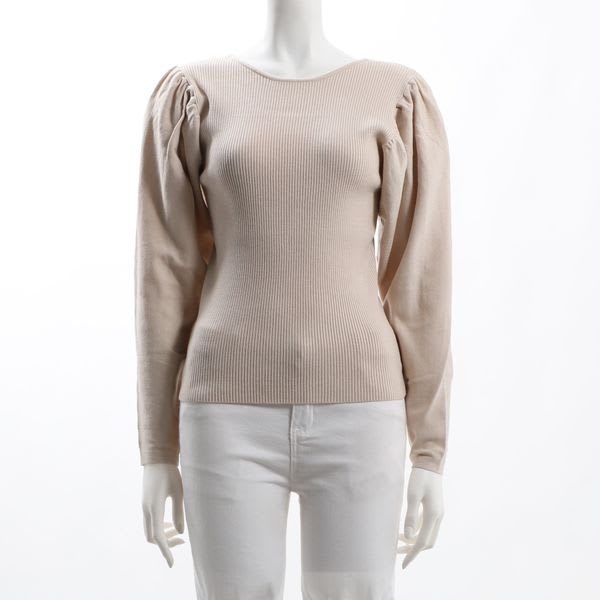 身頃がリブ編みになったボリュームスリーブニット。ボトムスにはペンシルスカートを合わせて女性らしく、デニムパンツでカジュアルにまとめてもいいですね。