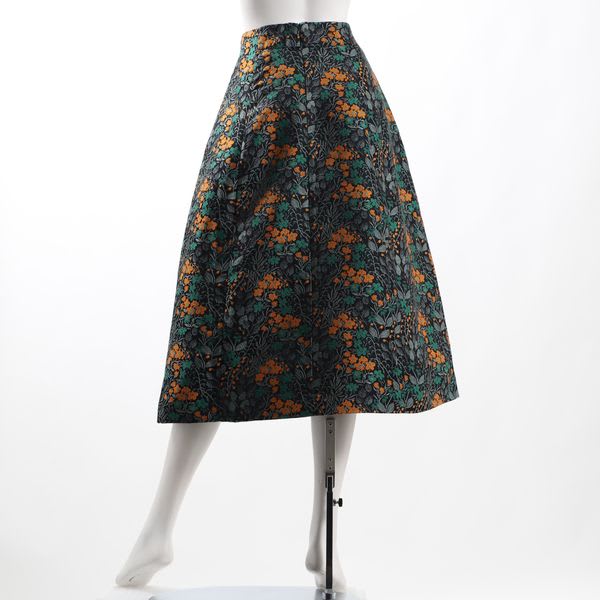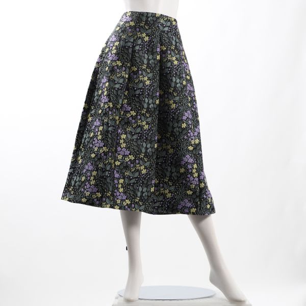 ボタニカル柄のタック入りフレアスカート。フリルネックのブラウスを合わせてフェミニンな着こなしに、リブニットを合わせてシルエットにメリハリを付けた着こなしも素敵です。