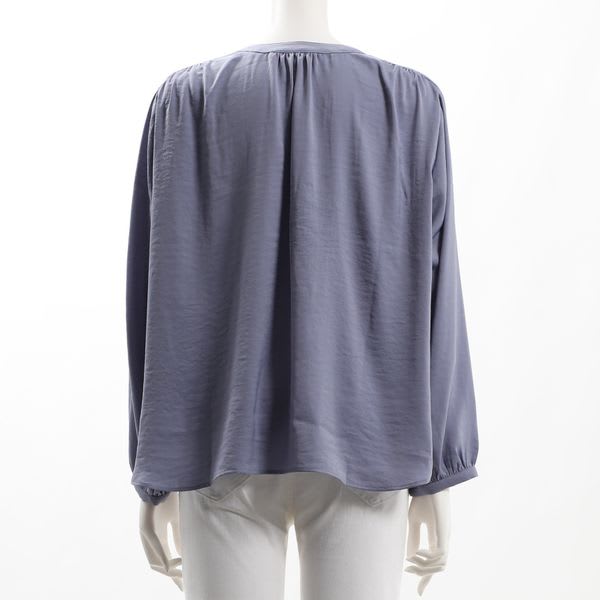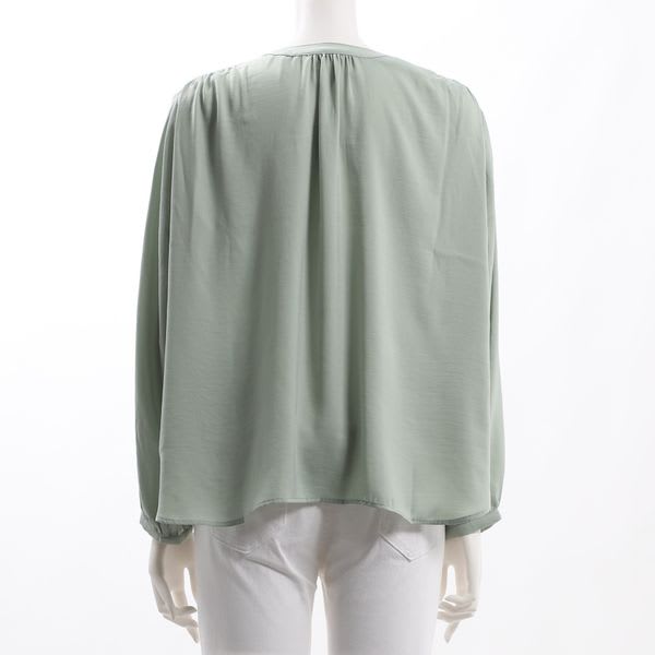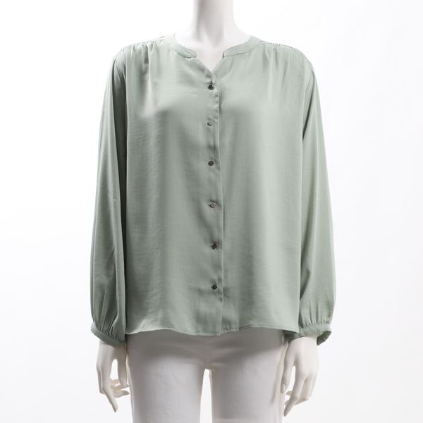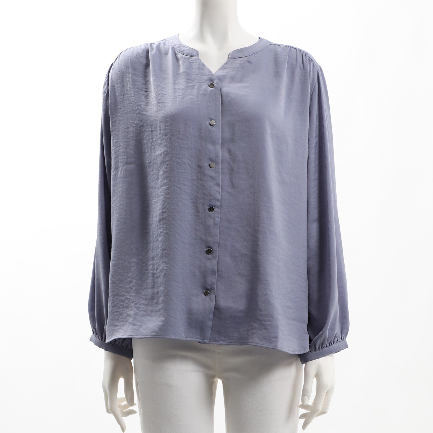 前ボタンデザインのブラウス。タイトスカートにパンプスを合わせてフェミニンに、ワイドパンツにローファーを合わせてマニッシュに仕上げても素敵です。