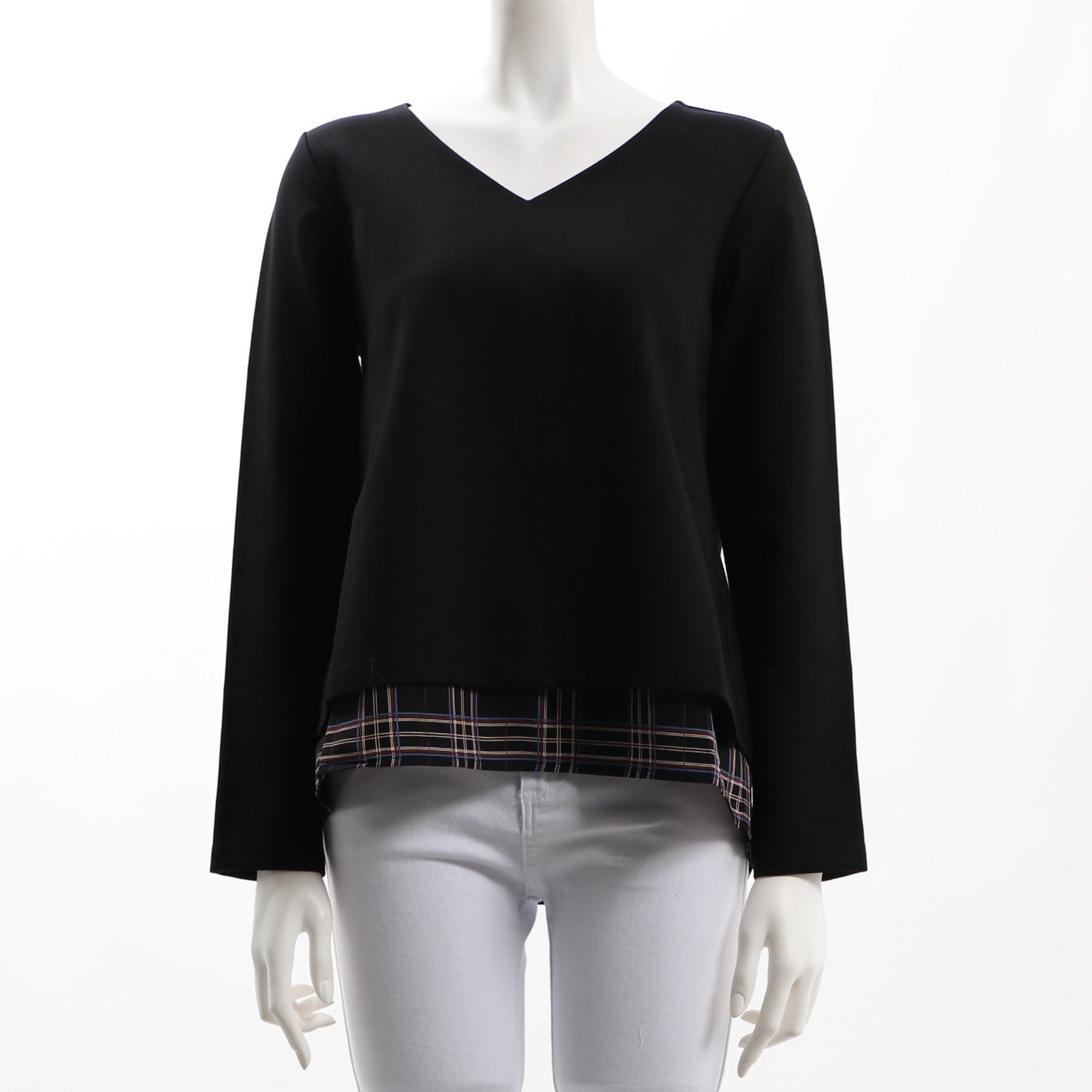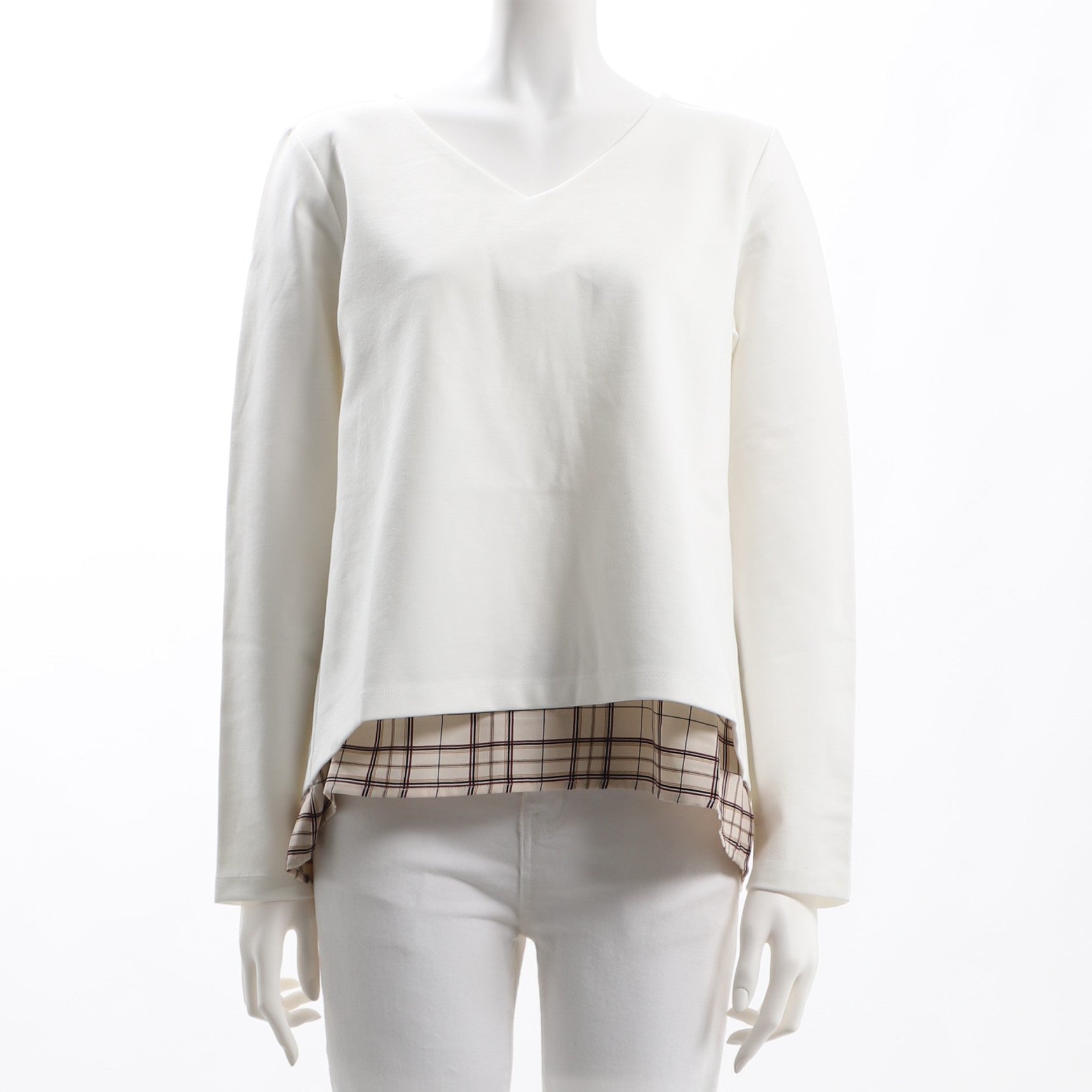 裾からのぞくチェック柄がアクセントになったレイヤード風カットソーです。テーパードパンツにパンプスでキレイめなスタイルに。デニムパンツにスニーカーでカジュアルな印象もいいですね。