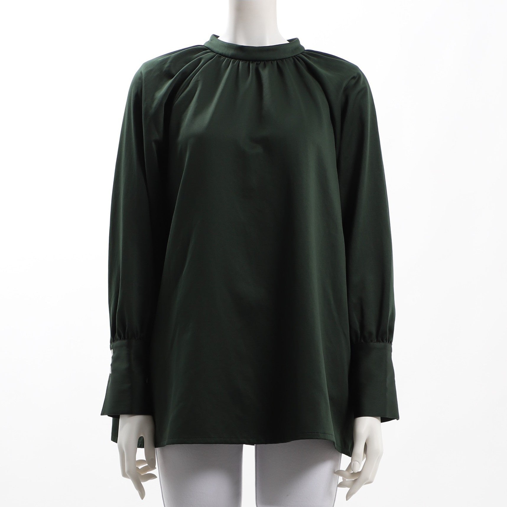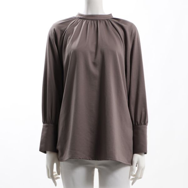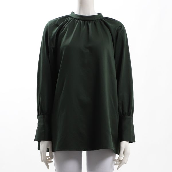 バックボタンがポイントのスタンドカラーブラウス。ボトムスにはテーパードパンツを合わせて辛さをプラスしても、タイトスカートで女性らしくまとめてもいいですね。