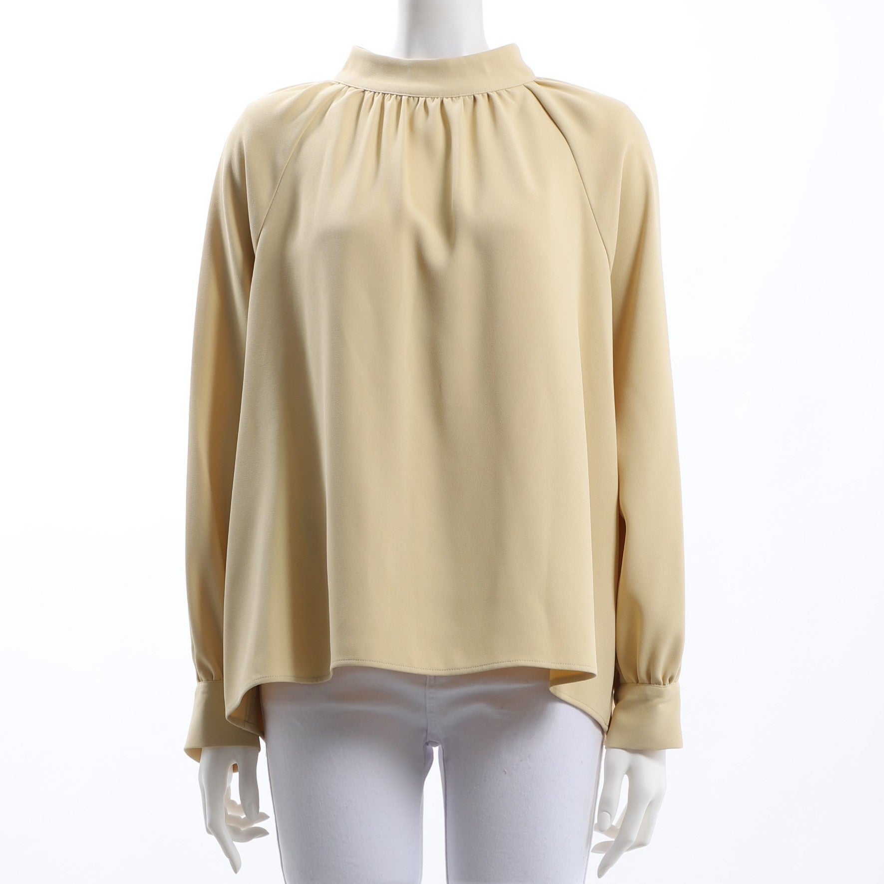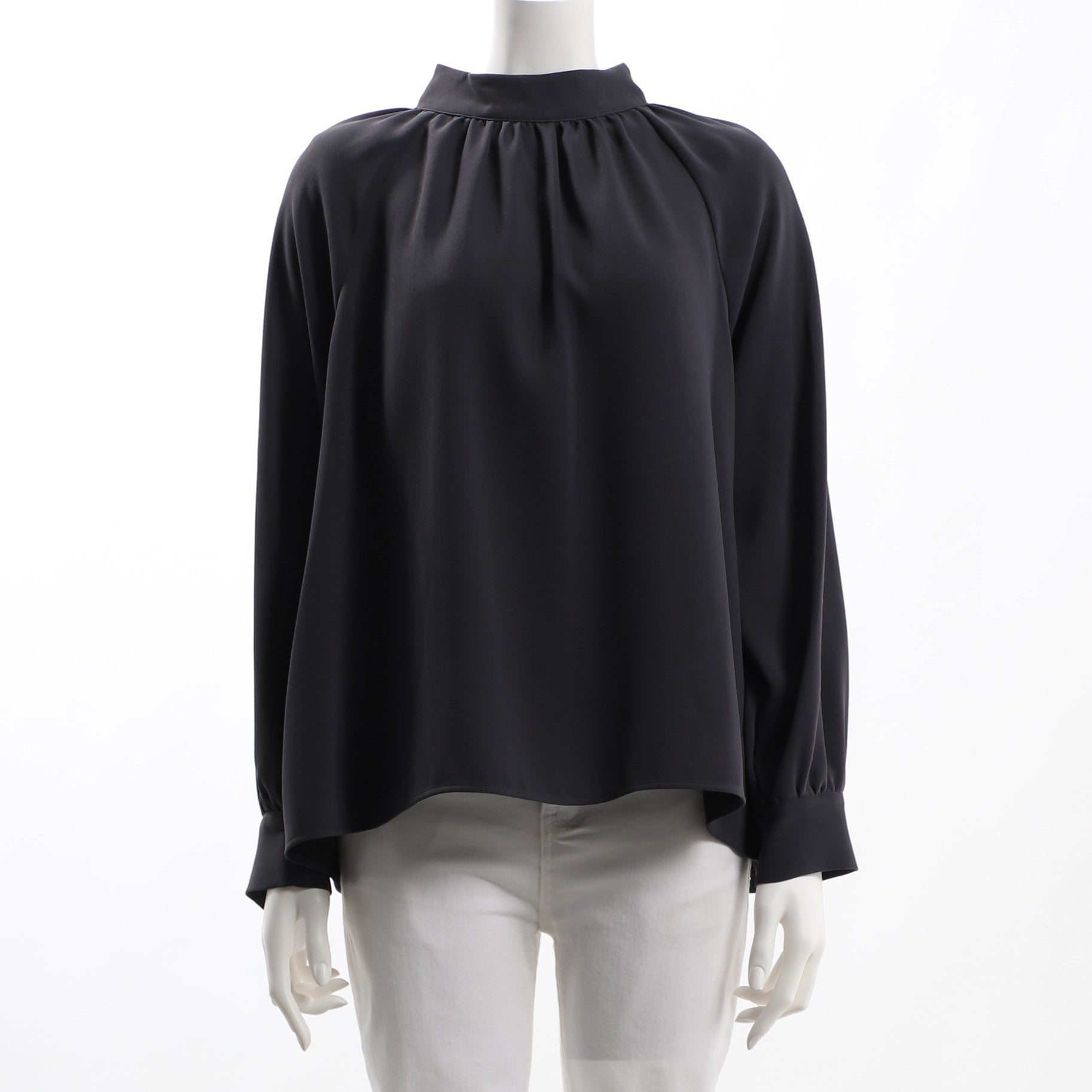 カフスやバックのパールボタンがポイントのギャザーネックブラウスです。