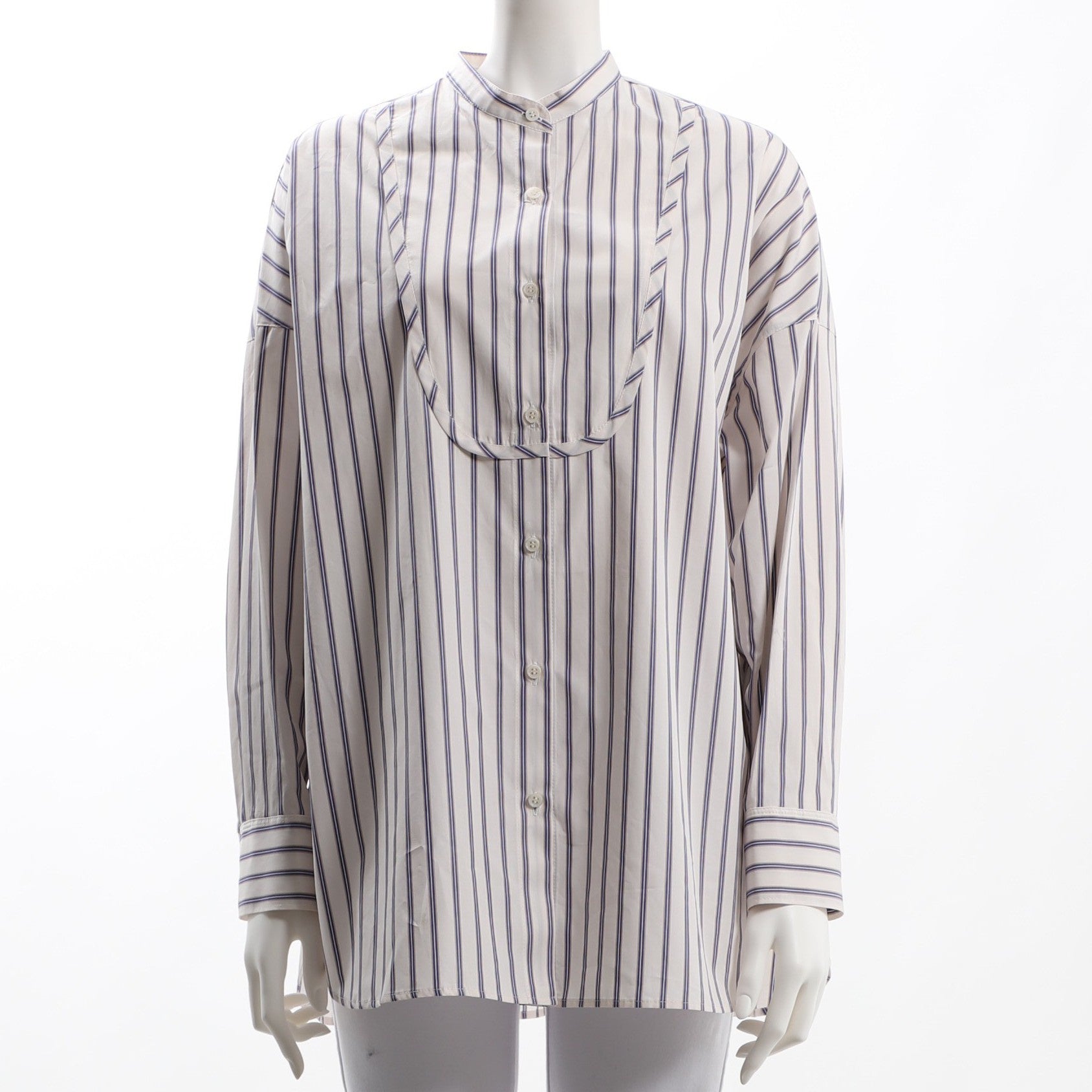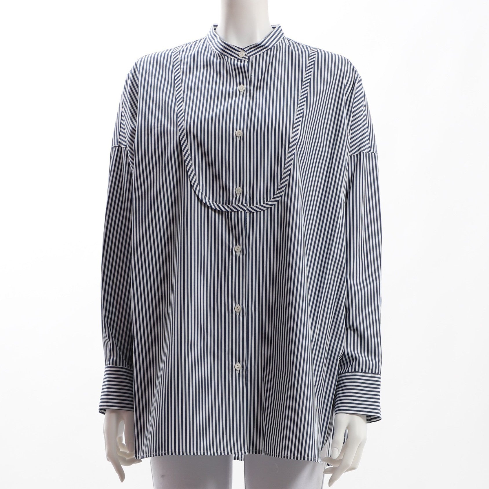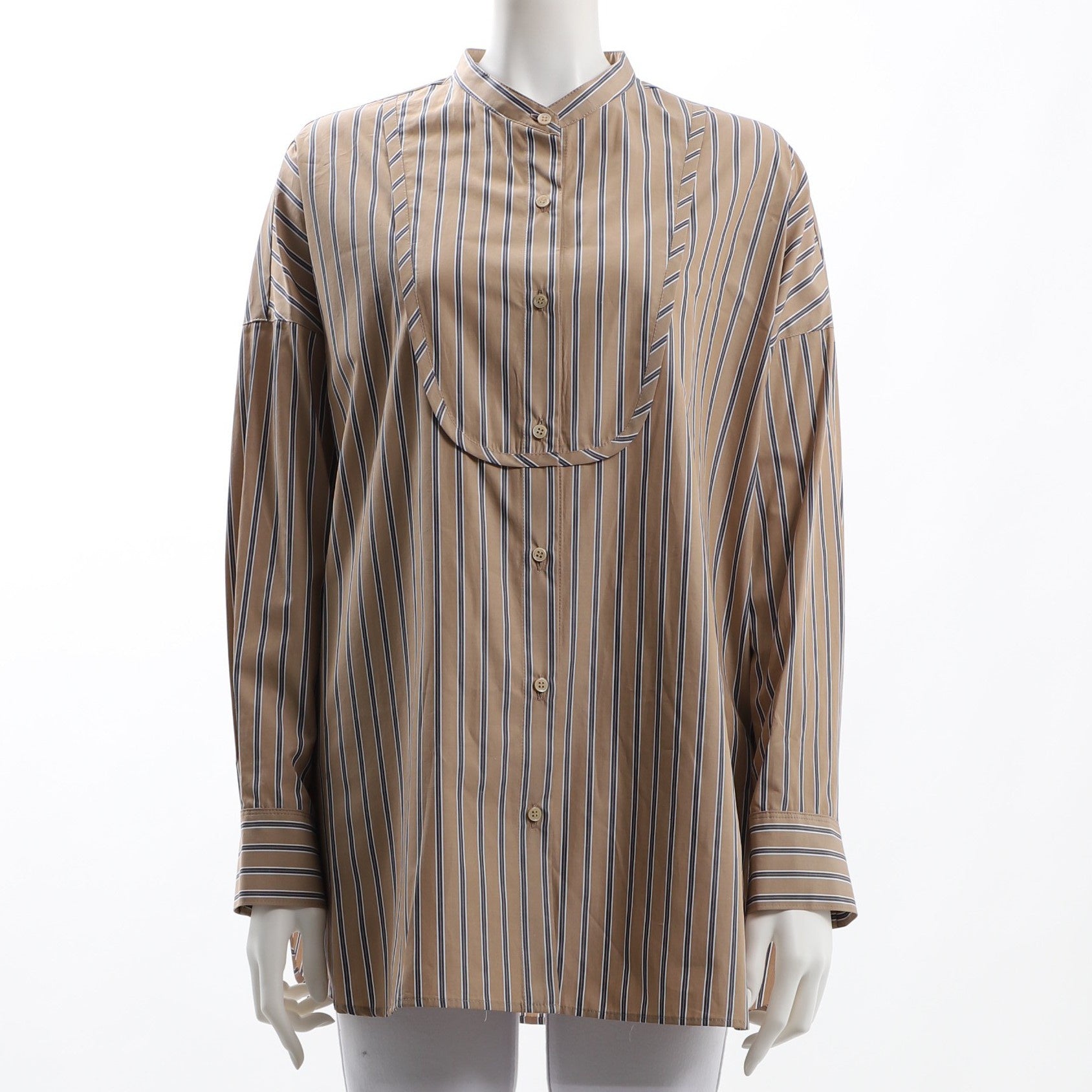 ブザム切り替えがポイントのストライプ柄バンドカラーシャツ。テーパードパンツを合わせてオフィススタイルに、プリーツスカートを合わせてお出かけスタイルもいいですね。