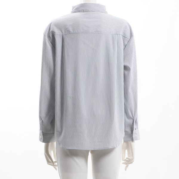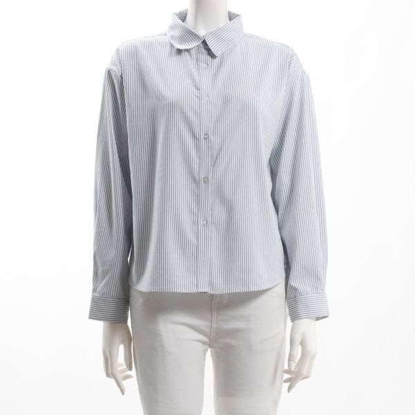 ストライプ柄の前開きシャツ。タイトスカートを合わせてオフィススタイルに、ギャザースカートを合わせてお出かけスタイルもおすすめです。