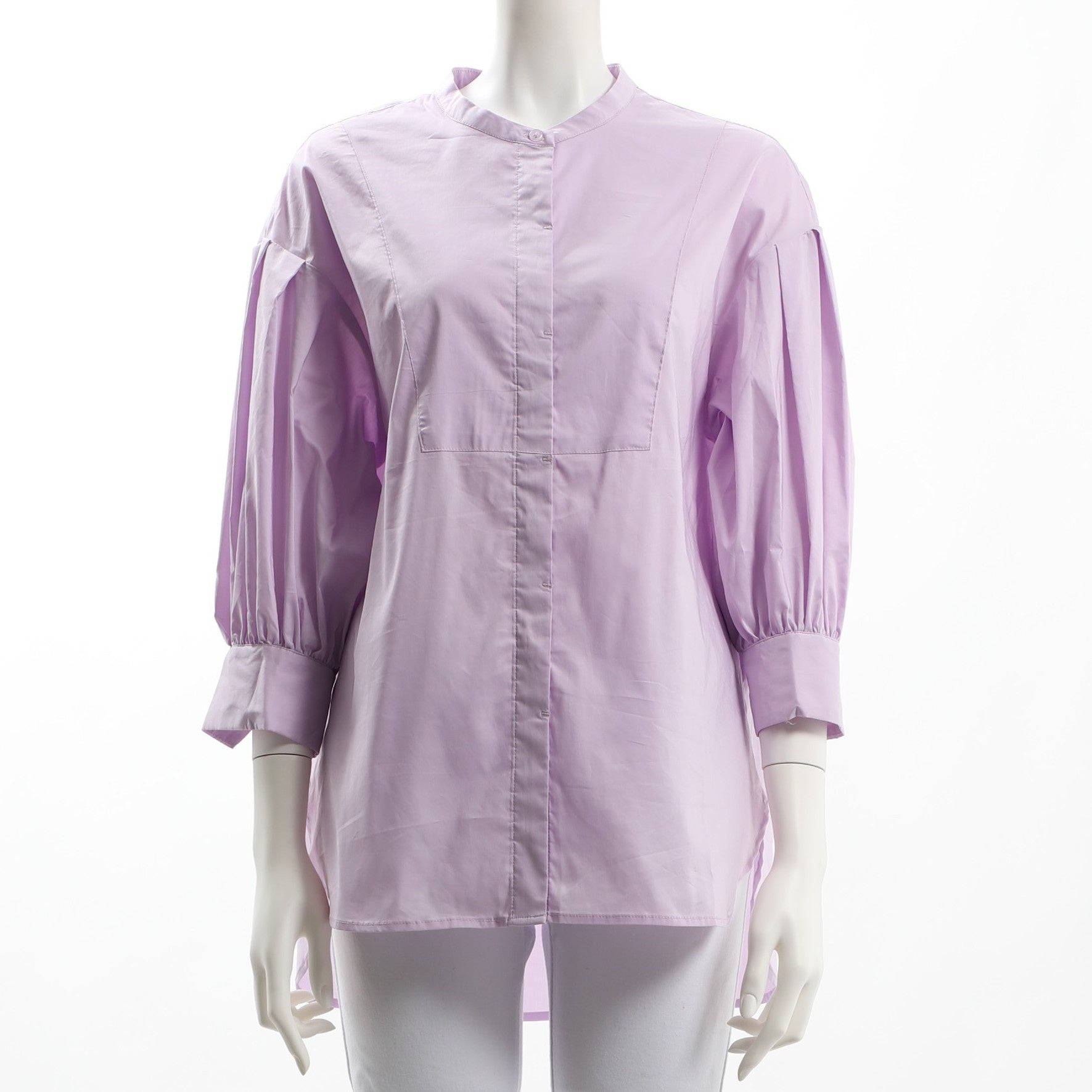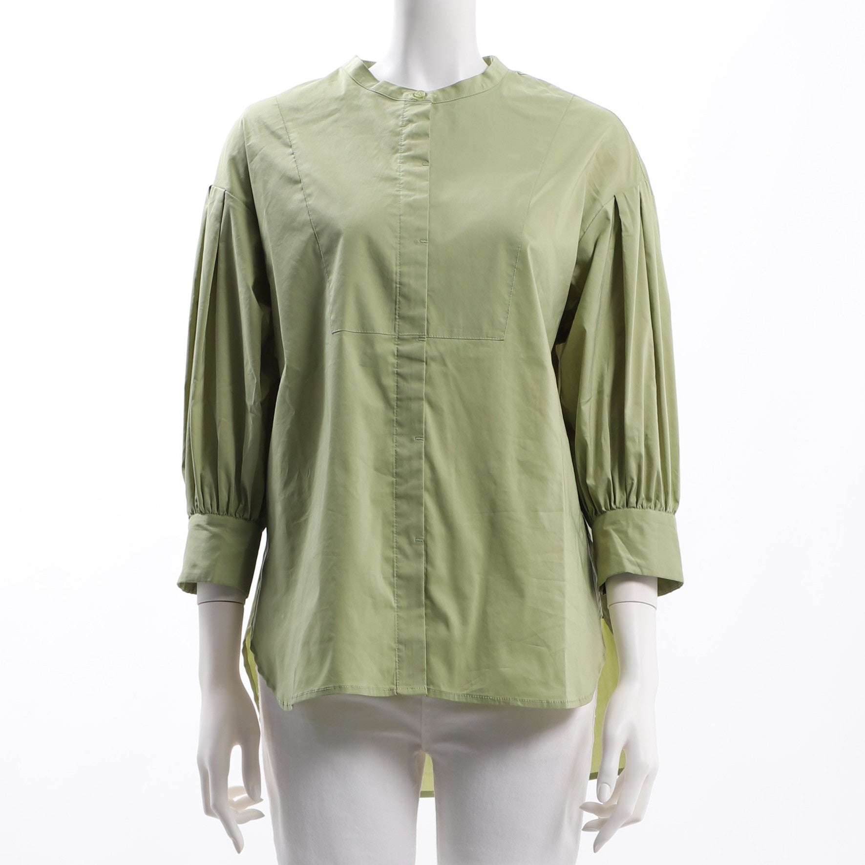 比翼仕立てのバンドカラーシャツ。タイトスカートを合わせてきれいめカジュアルスタイルに、デニムパンツを合わせてリラックススタイルに着こなすのもいいですね。