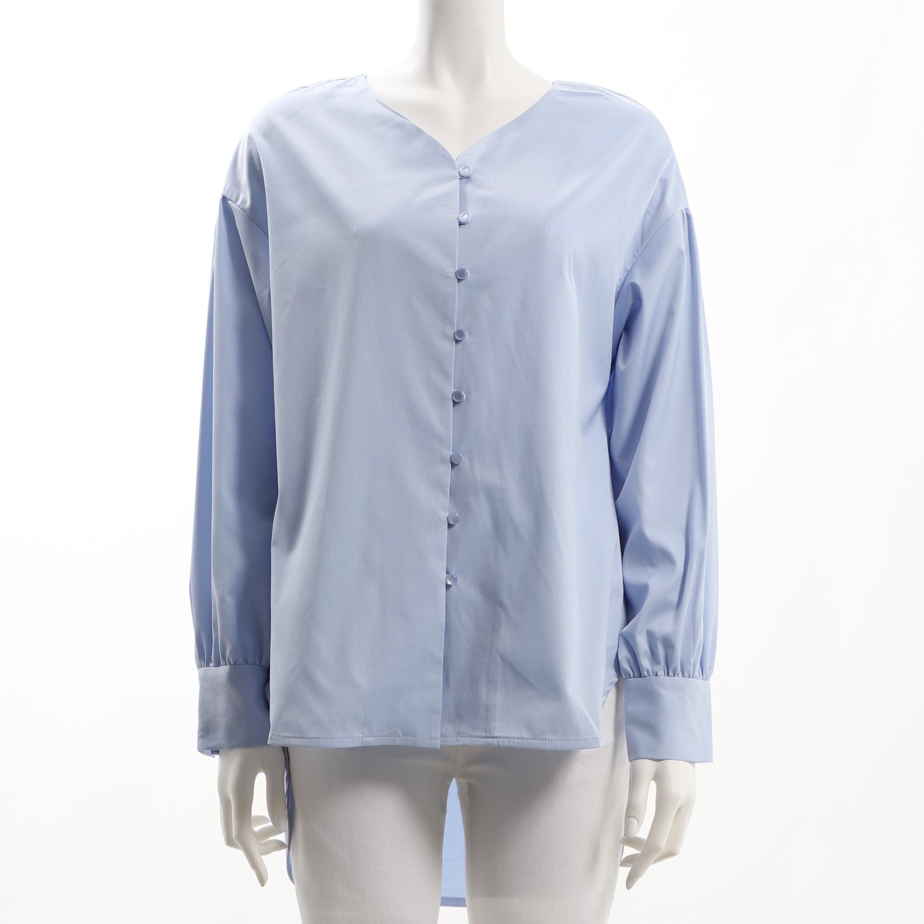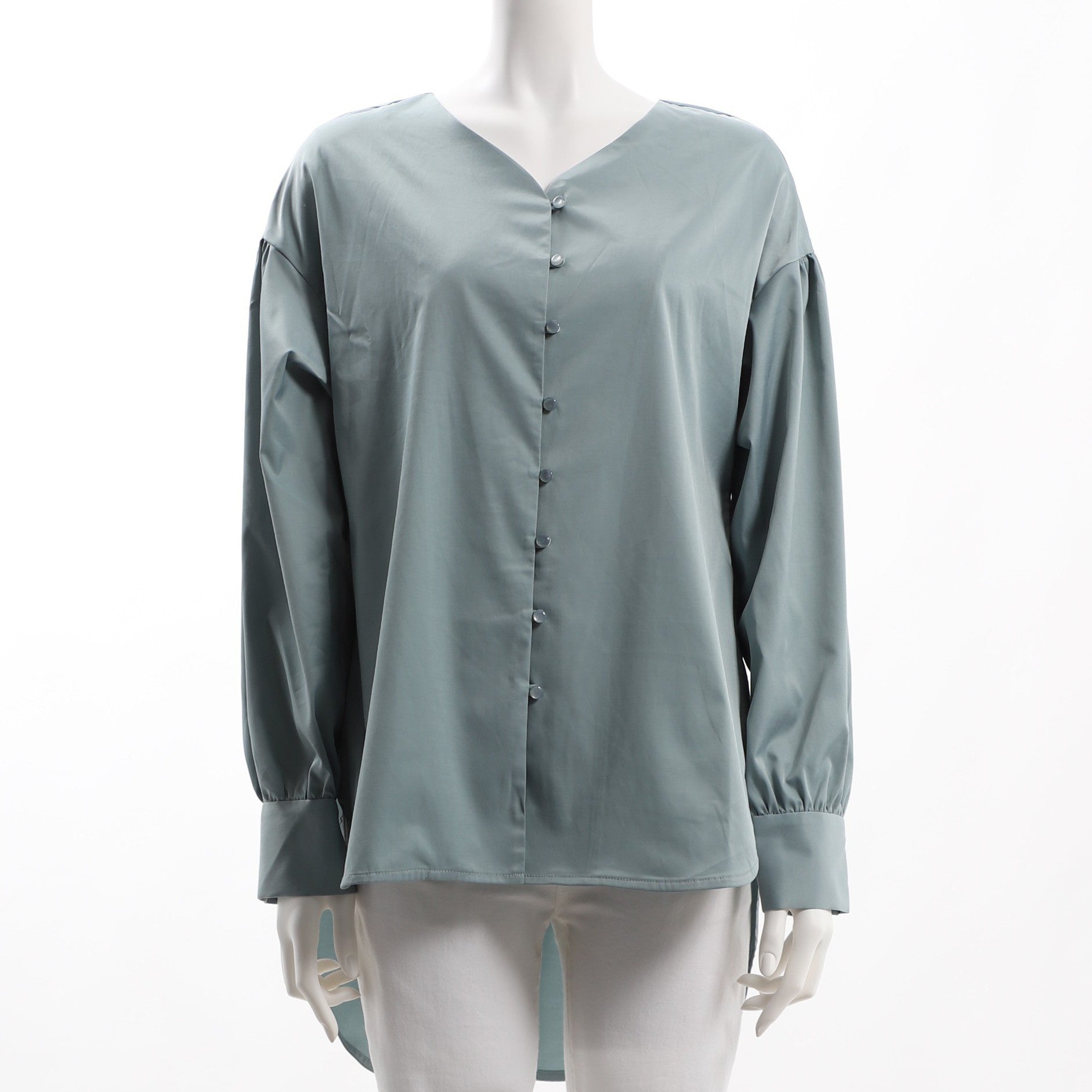 バックテールデザインのVネックブラウス。スキニーパンツを合わせてシルエットにメリハリを付けた着こなしに、ロングプリーツスカートを合わせてルーズに着こなすのもおすすめです。
