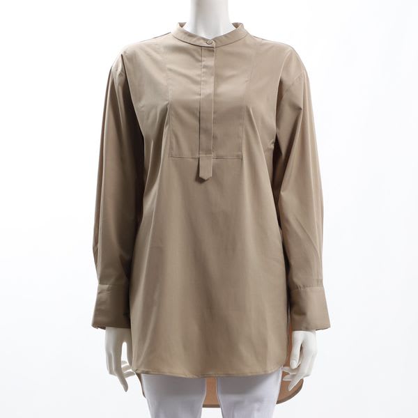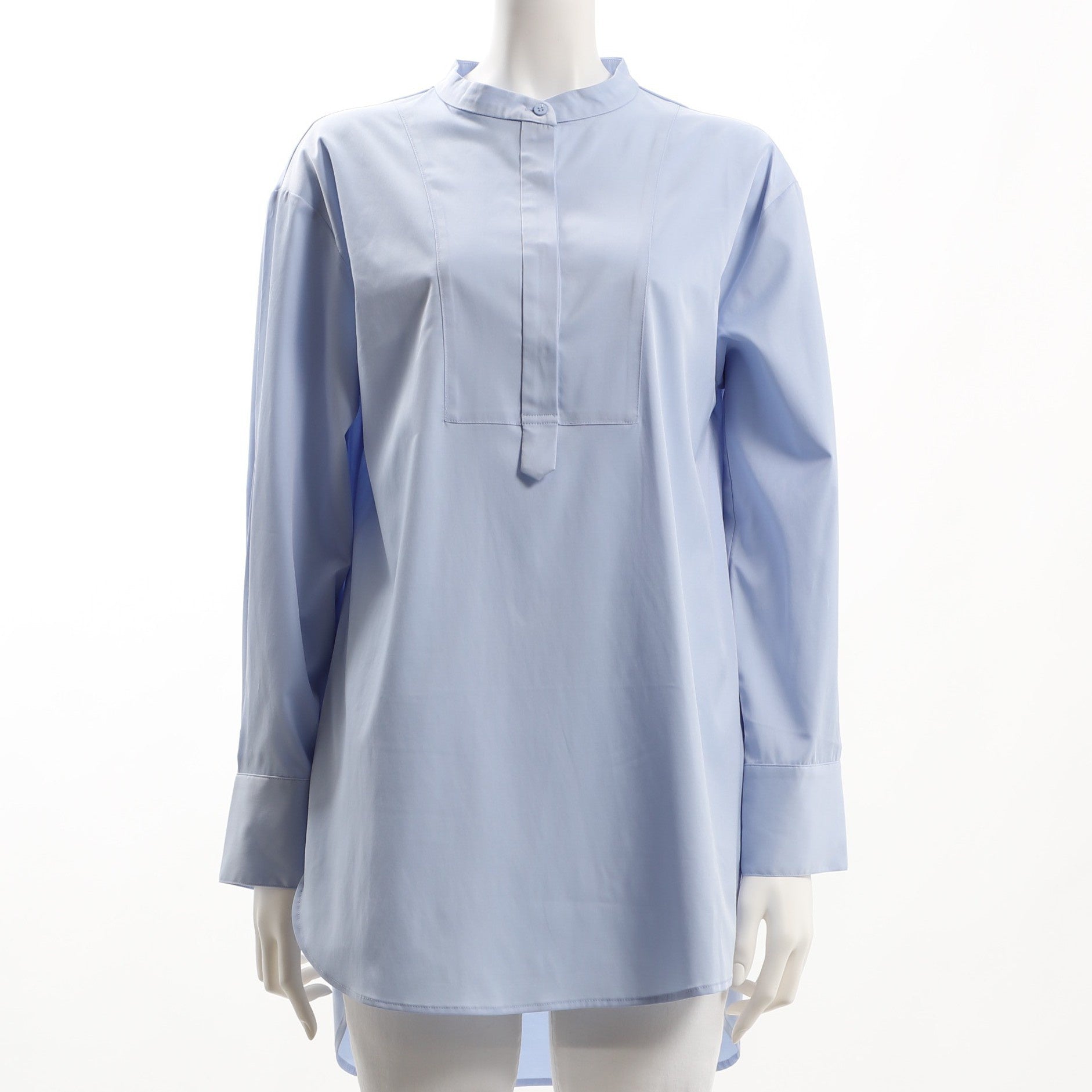 ブザム切り替えがポイントのバンドカラーブラウス。ボトムスにはデニムパンツを合わせて気負わずに、テーパードパンツでマニッシュにまとめても良いですね。