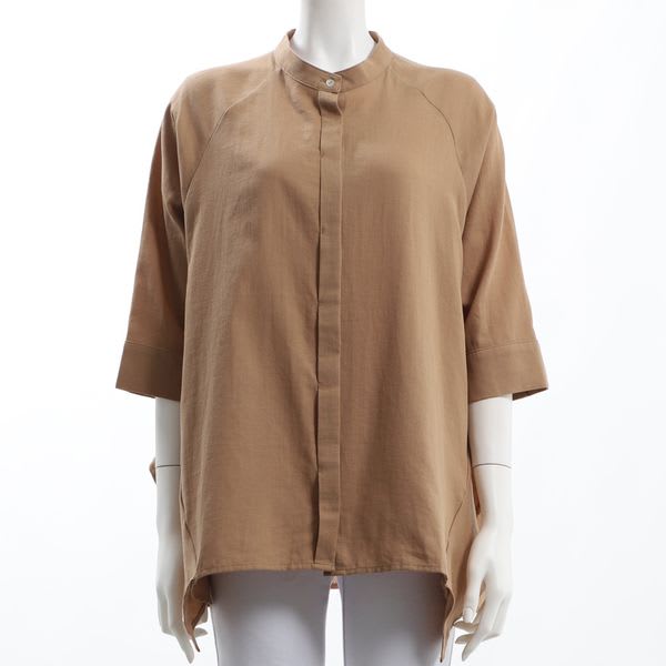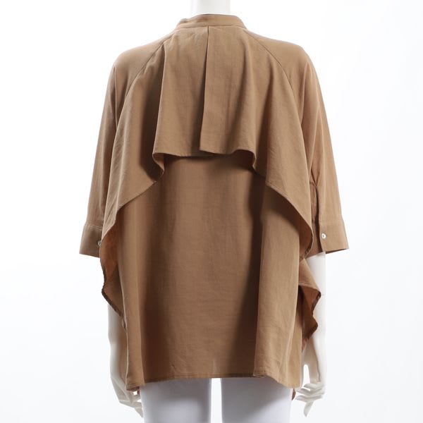 バックデザインが特徴的なバンドカラーブラウス。テーパードパンツとヒールパンプスを合わせて綺麗めなスタイルに、デニムパンツとフラットシューズを合わせてカジュアルスタイルもいいですね。