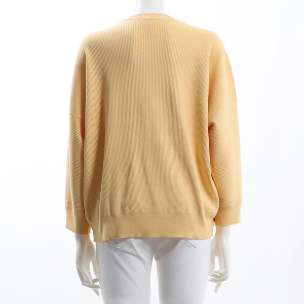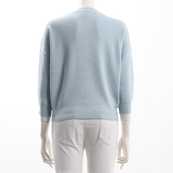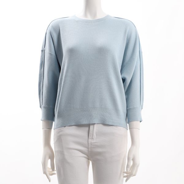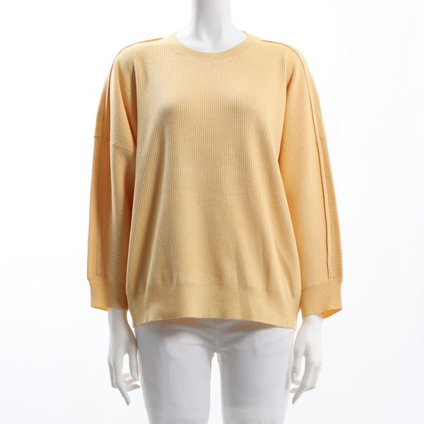 肩からお袖にかけたデザインがポイントのクルーネックニットです。ボトムスにはデニムパンツを合わせてカジュアルに、ペンシルスカートで女性らしくまとめてもいいですね。