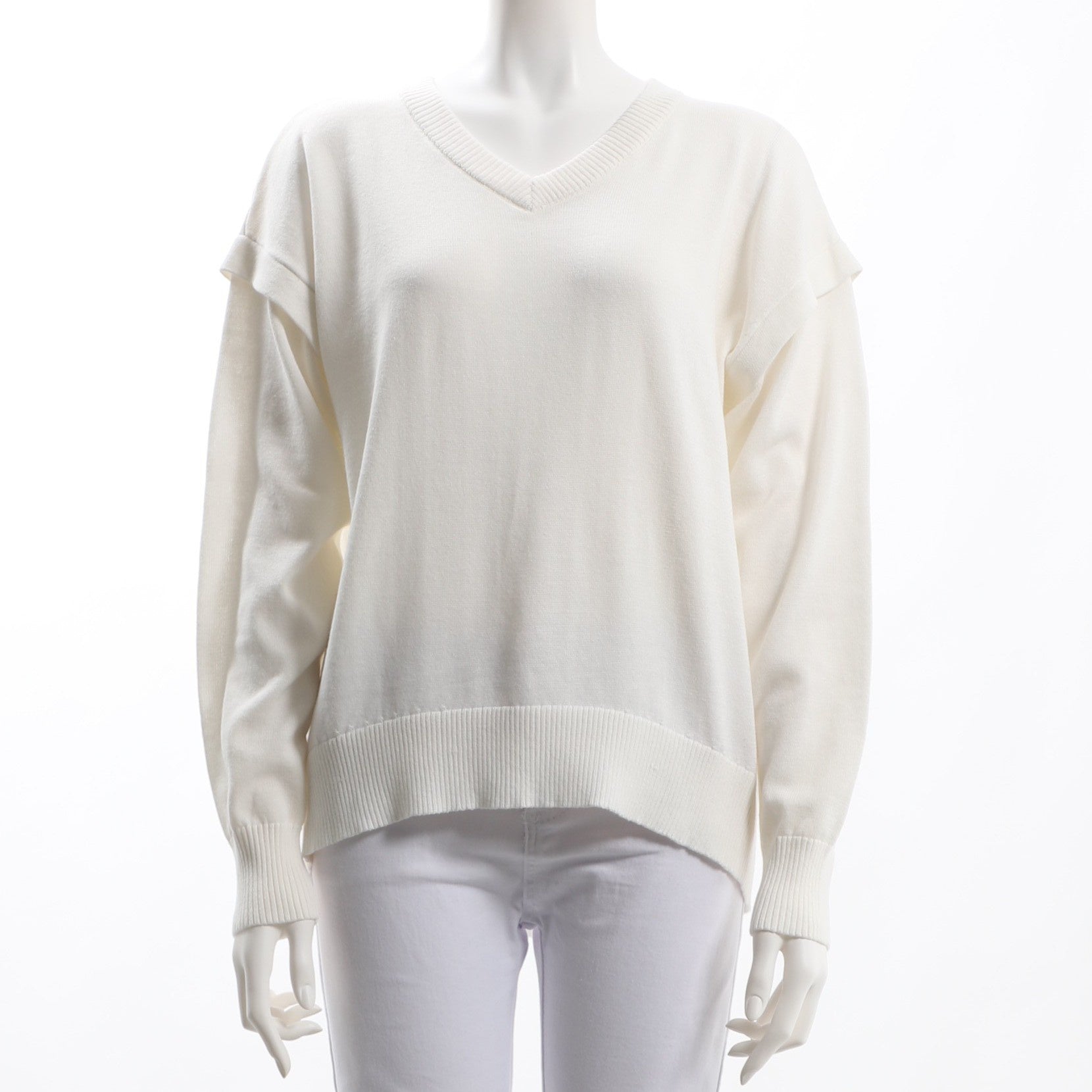 袖やバックスタイルのタックがポイントのVネックニット。タイトスカートを合わせて女性らしい着こなしに、ワイドパンツを合わせてマニッシュに着こなすのもいいですね。