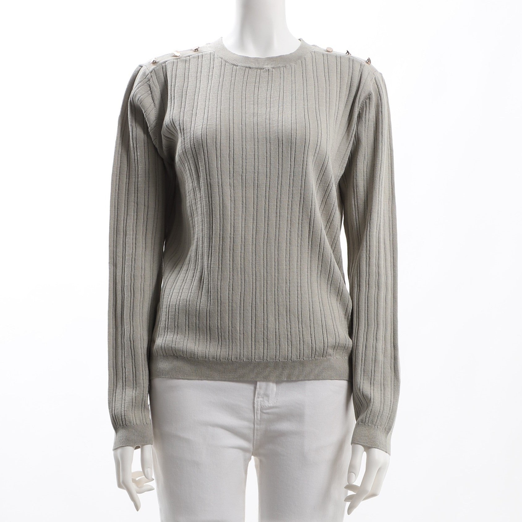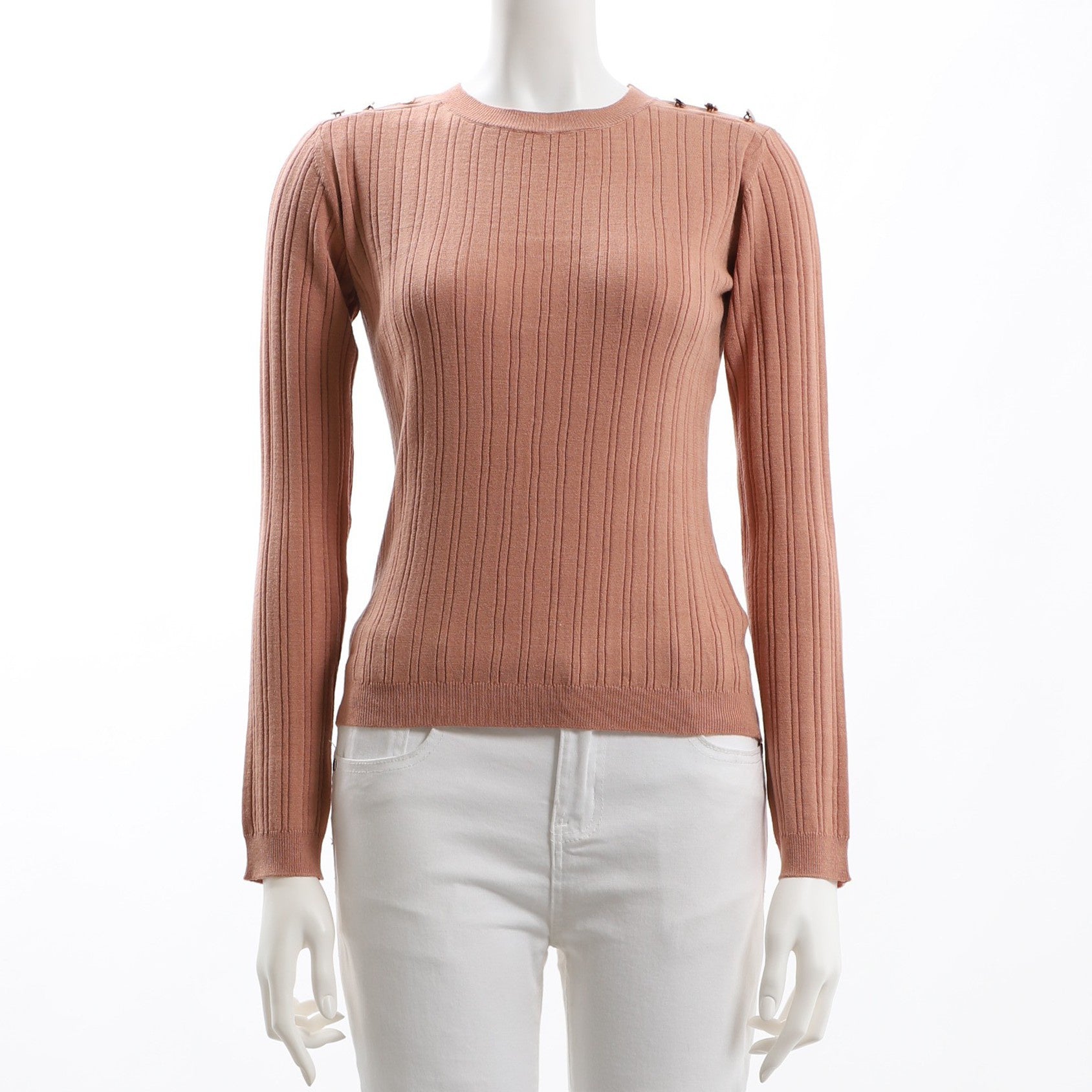 肩のボタンがワンポイントのリブニット。テーパードパンツを合わせてスマートな着こなしに、フレアスカートを合わせてシルエットにメリハリを付けた着こなしも素敵ですよ。