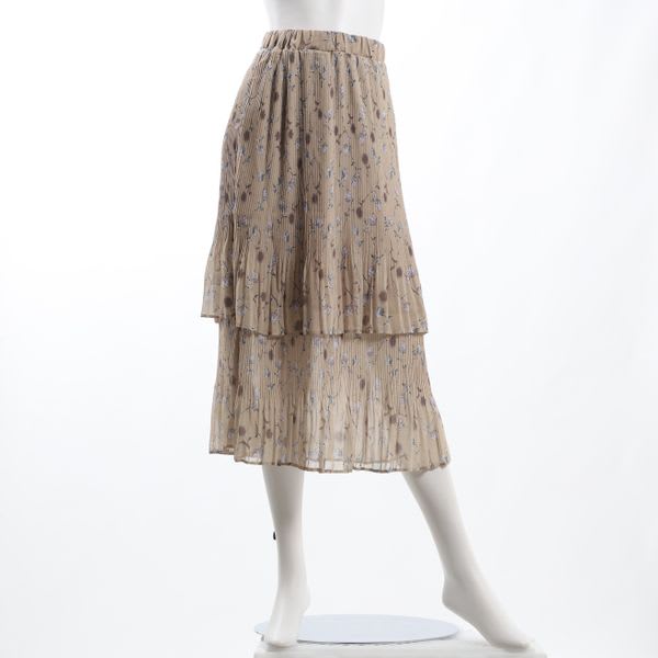 プリーツスカートを二段重ねたようなデザインの総柄スカート。