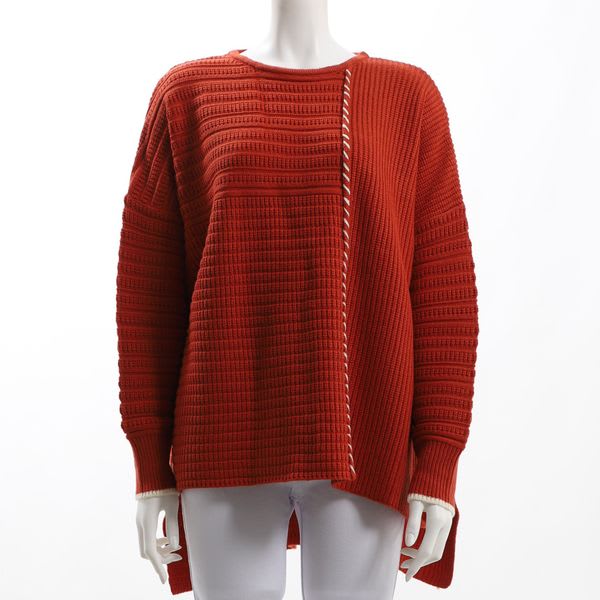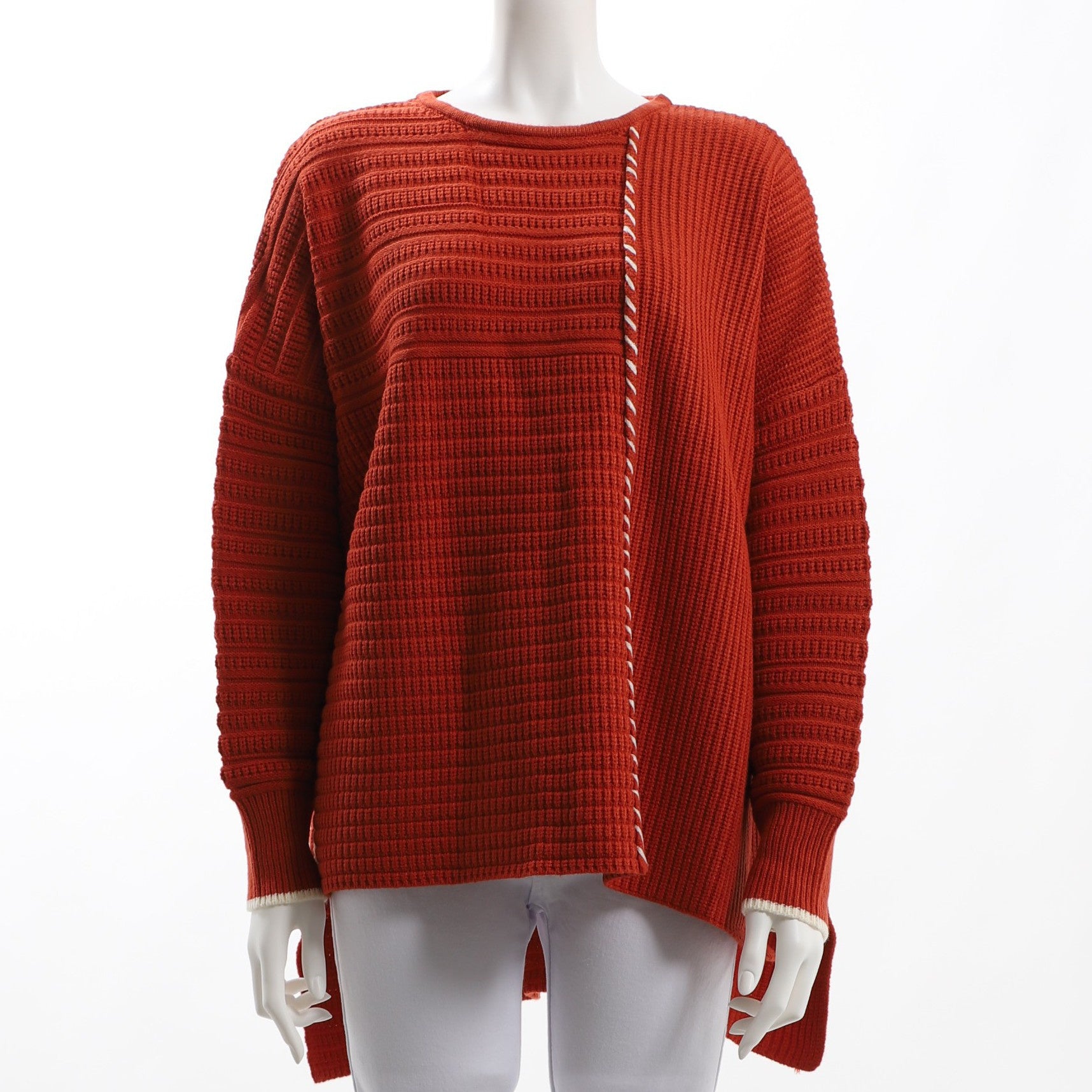 袖や身頃のステッチの配色やバックテールのデザインがポイントのミドルゲージニット。マーメイドスカートを合わせて女性らしい着こなしに、デニムパンツを合わせてマニッシュに着こなすのもいいですね。