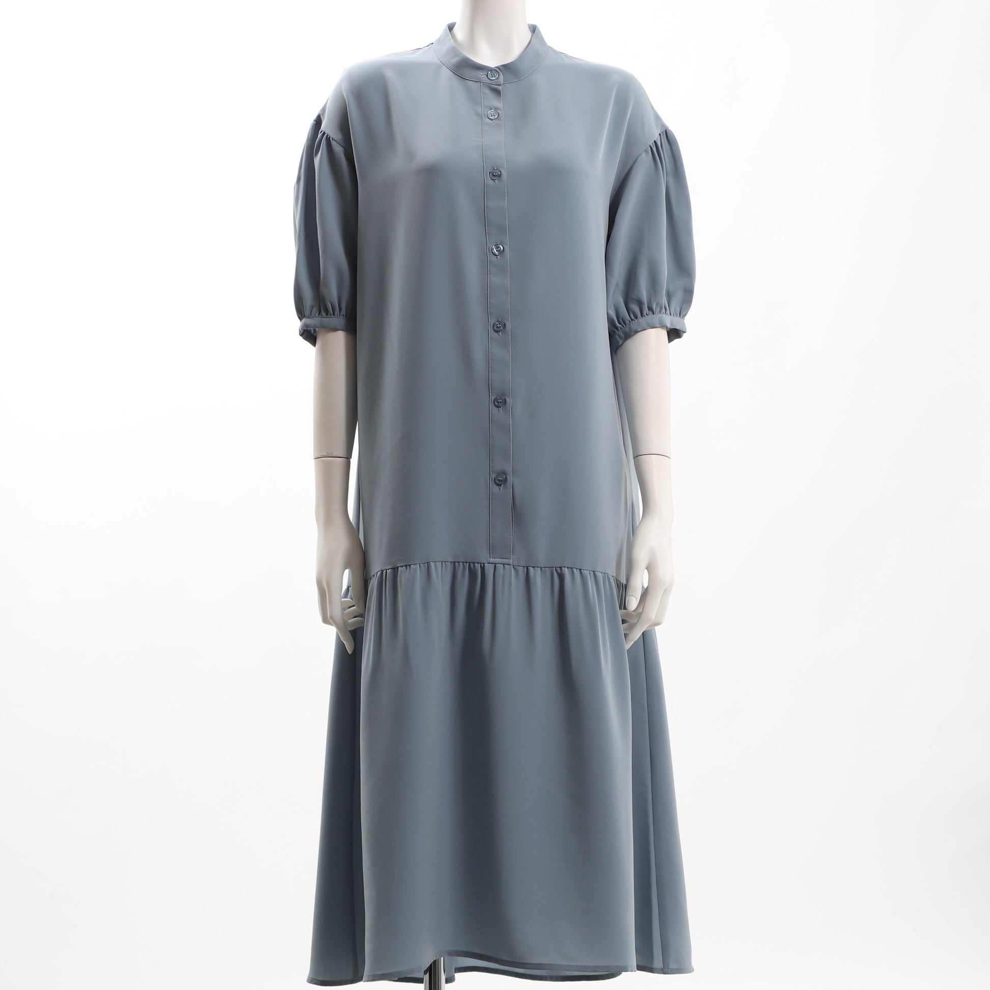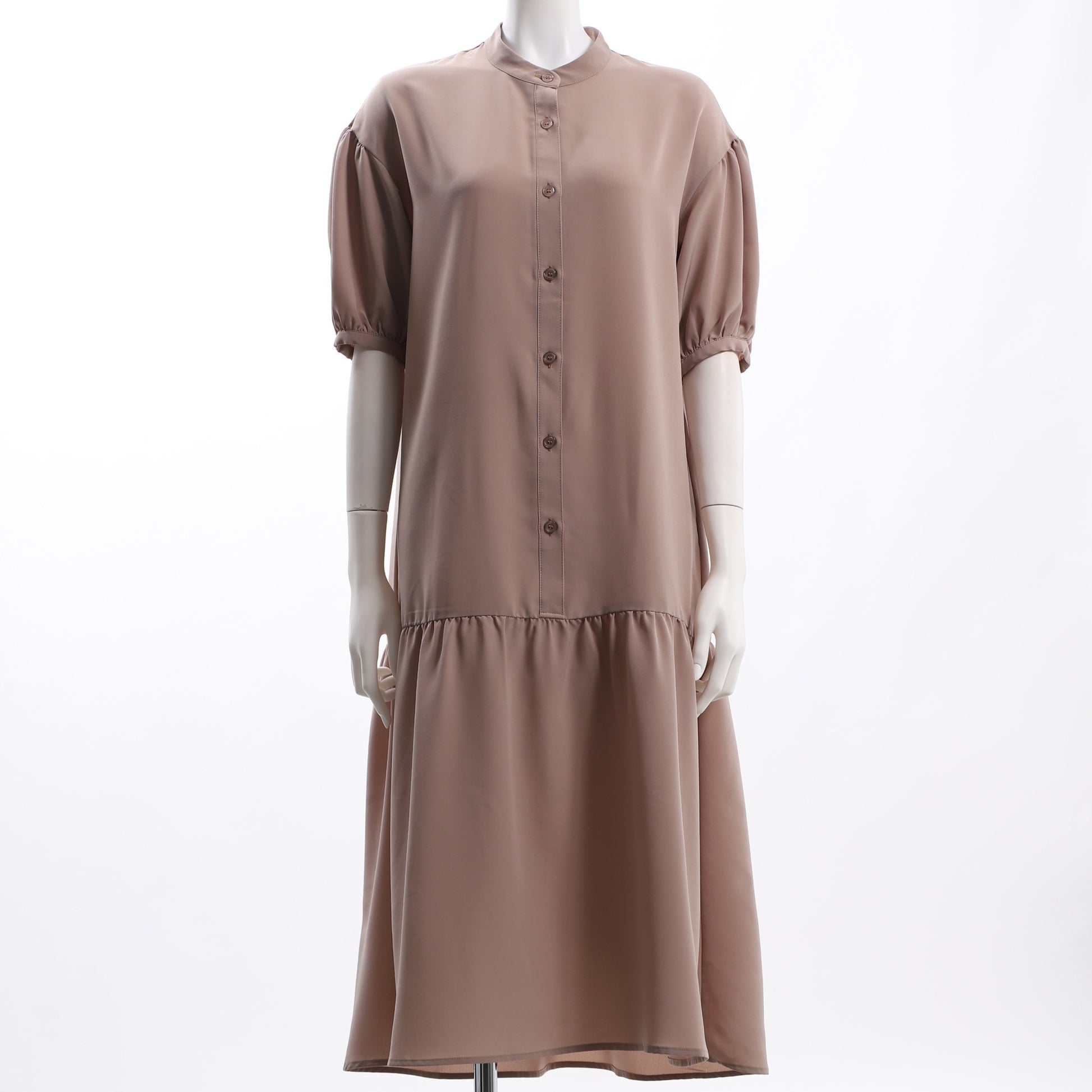 切り替えがポイントのバンドカラーワンピース。レザーのハンドバッグとラウンドパンプスを合わせて女性らしいスタイルに、ショルダーバッグとスニーカーを合わせてカジュアルスタイルもおすすめです。