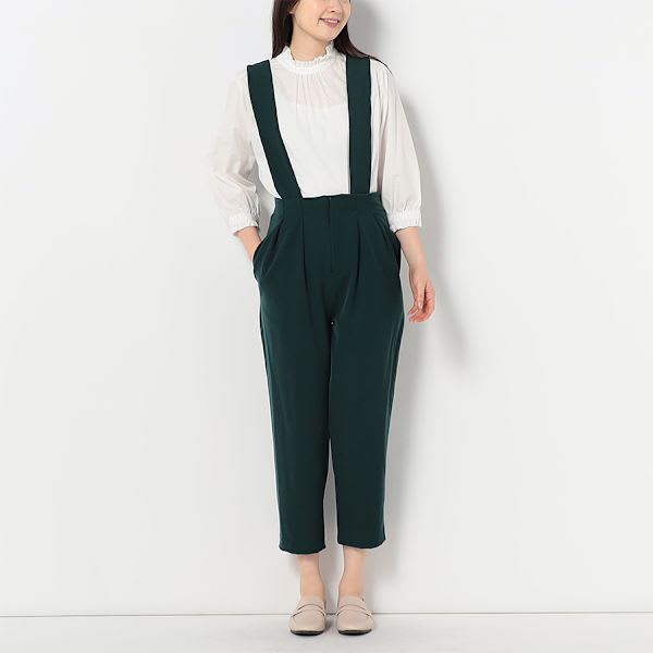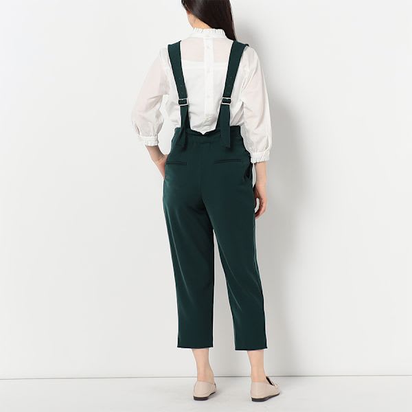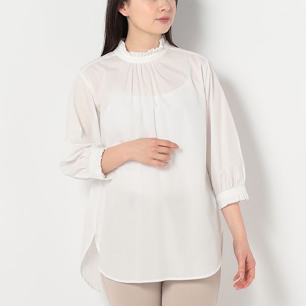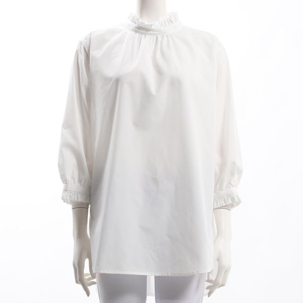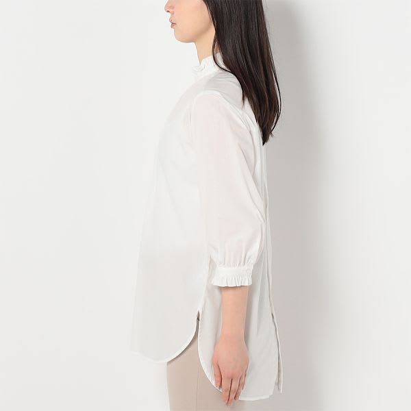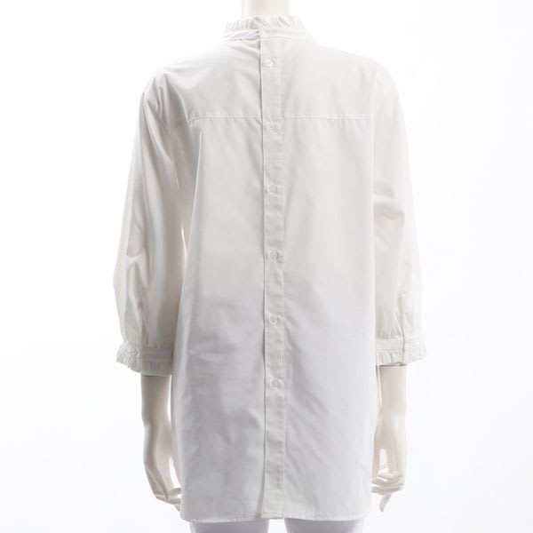 バックボタンがポイントのフリルネックブラウス。フレアスカートとラウンドパンプスを合わせてフェミニンスタイルに、テーパードパンツとポインテッドトゥパンプスを合わせて綺麗めなスタイルもおすすめです。