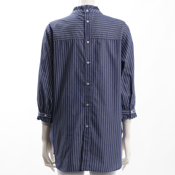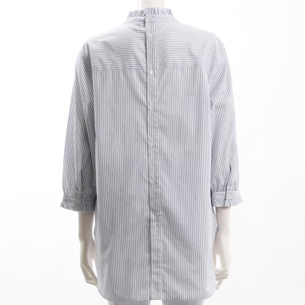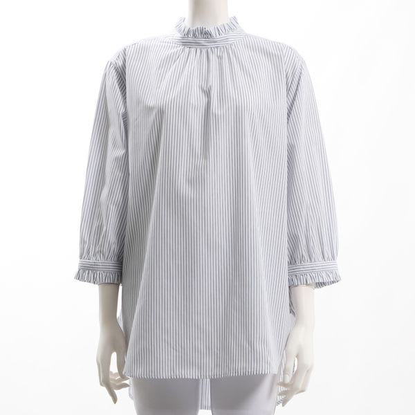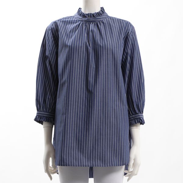ストライプ柄のフリルネックブラウス。フレアスカートとラウンドパンプスを合わせて女性らしいスタイルに、テーパードパンツとポインテッドトゥパンプスを合わせて綺麗めなスタイルもいいですね。