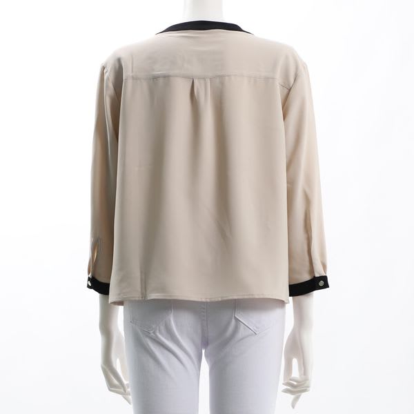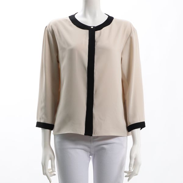ネックラインのデザインがポイントのバイカラーブラウス。ボトムスにはAラインスカートを合わせて女性らしく、テーパードパンツで辛めに仕上げてもステキです。