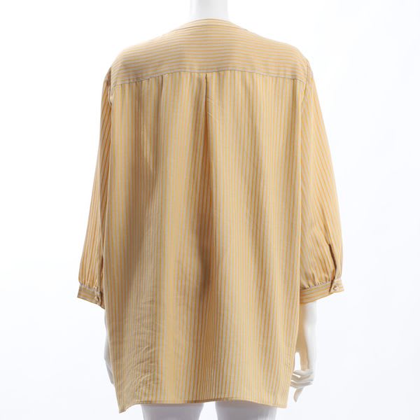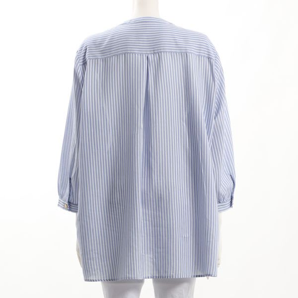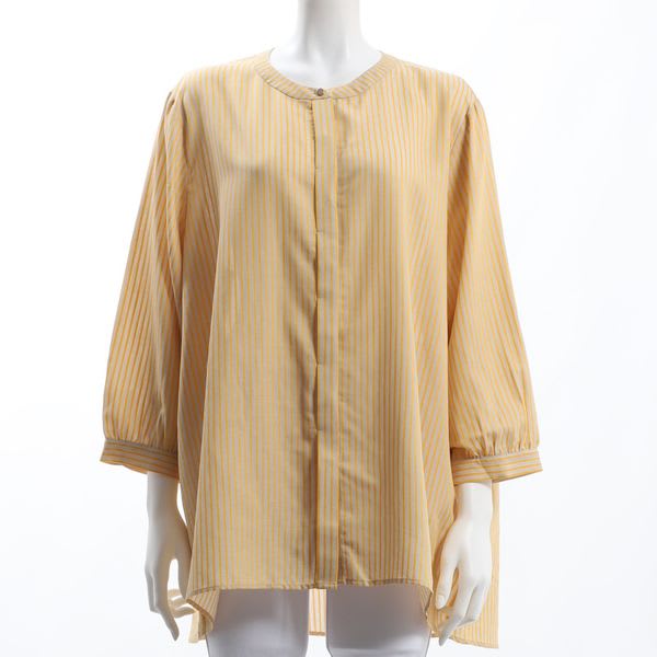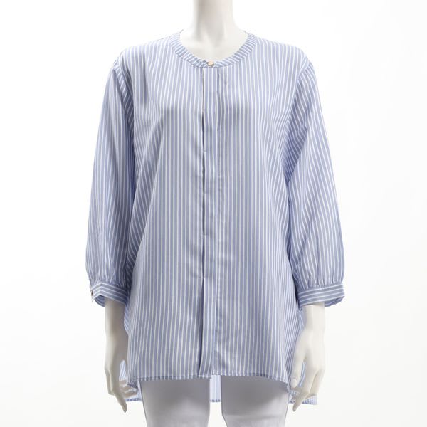 ストライプ柄の比翼シャツです。テーパードパンツとローファーを合わせてマニッシュなスタイルに、デニムパンツとフラットシューズを合わせてカジュアルスタイルも素敵ですね。