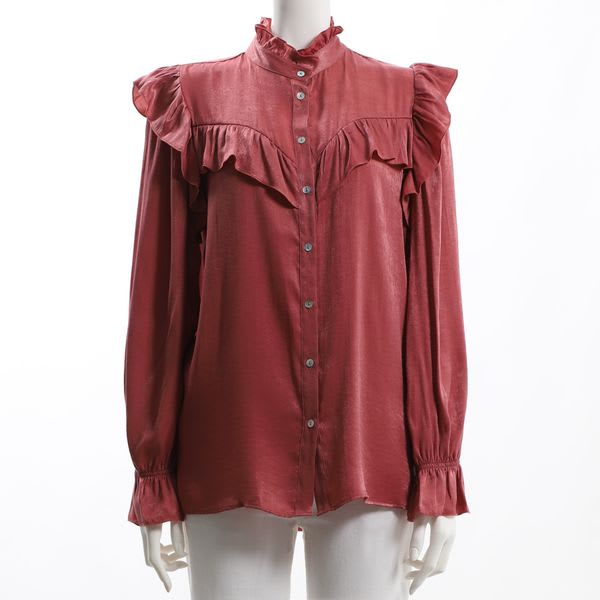 フリルをあしらった前開きブラウス。ボトムスにはテーパードパンツを合わせて甘辛MIXスタイルに、タイトスカートでフェミニンにまとめてもいいですね。