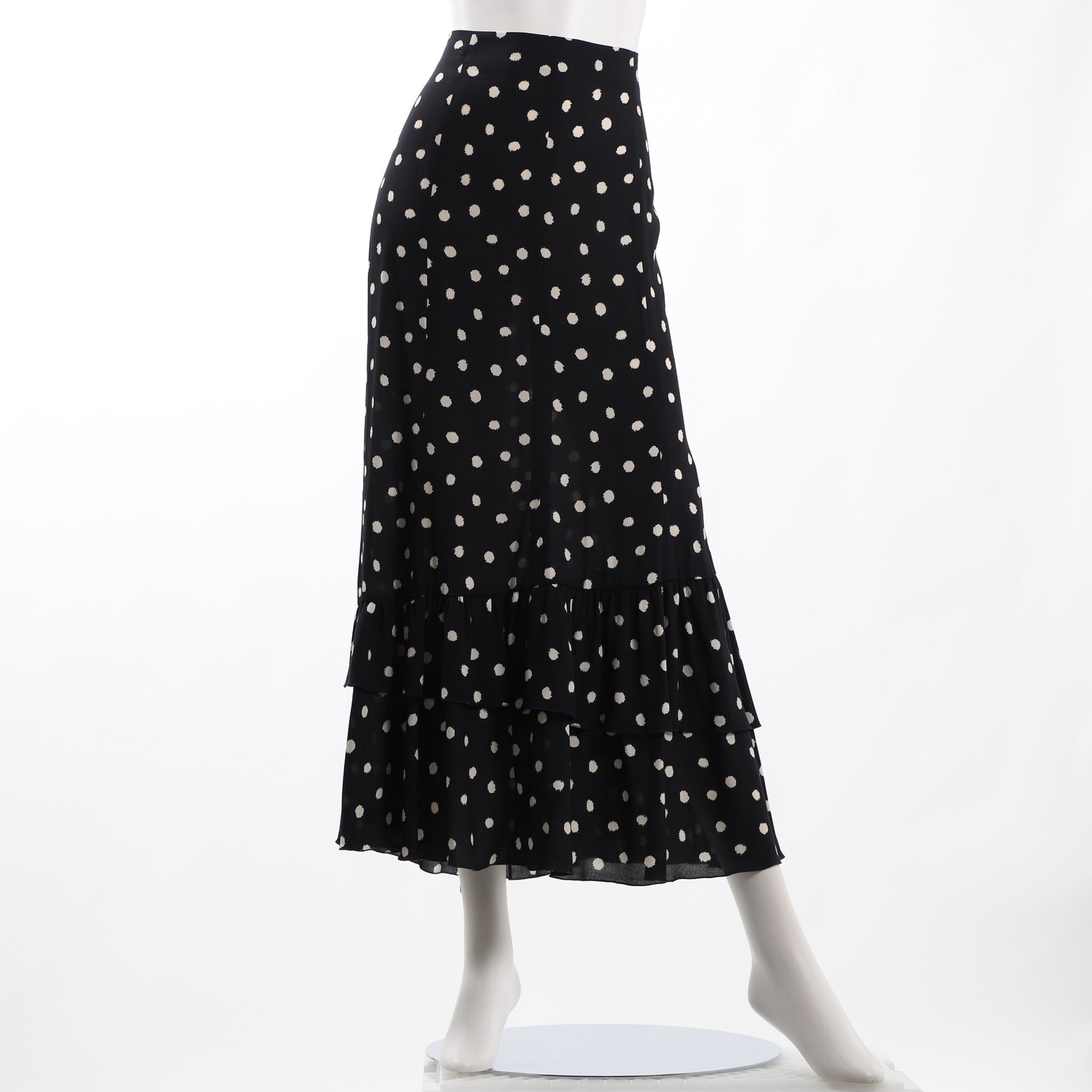 裾のラッフルデザインがポイントのドット柄スカート。ふんわりと広がる程良いボリューム感で、トップスを選ばない合わせやすいシルエットです。ほんのりと光沢感のある、シルクちりめんのような柔らかいタッチが特徴。