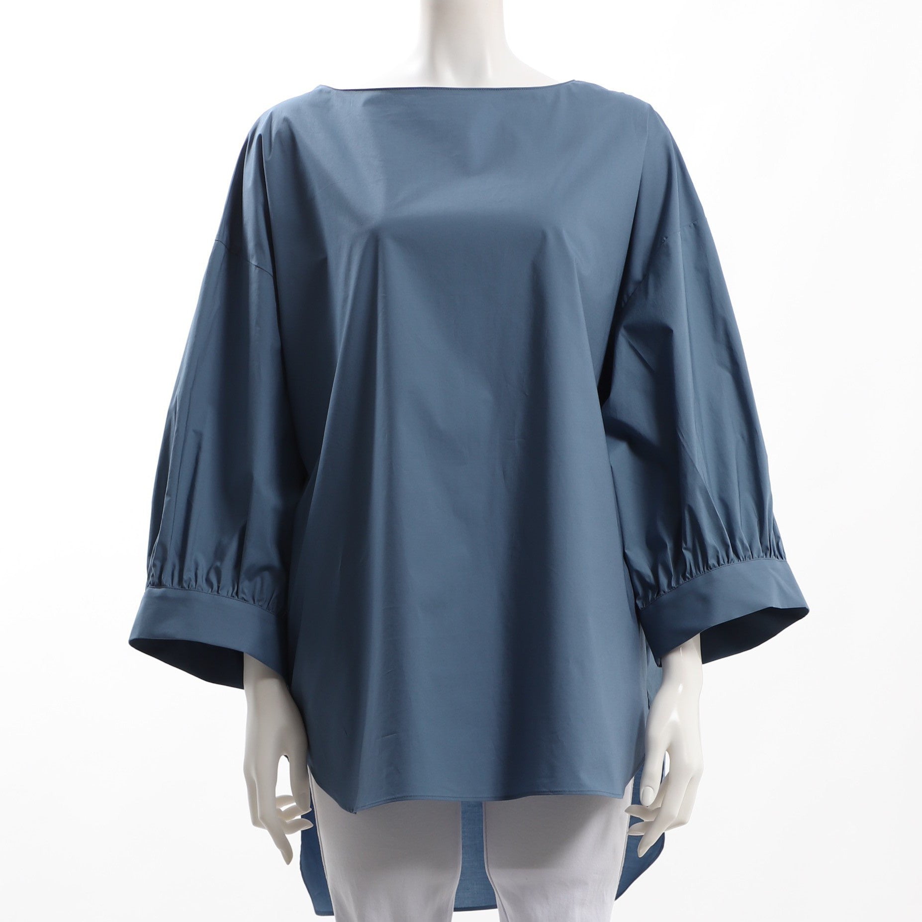 ハリのあるタイプライター素材が立体的なシルエットを演出するプルオーバーブラウス。ウエストイン、アウト共に楽しめる程良く長さのある丈感。