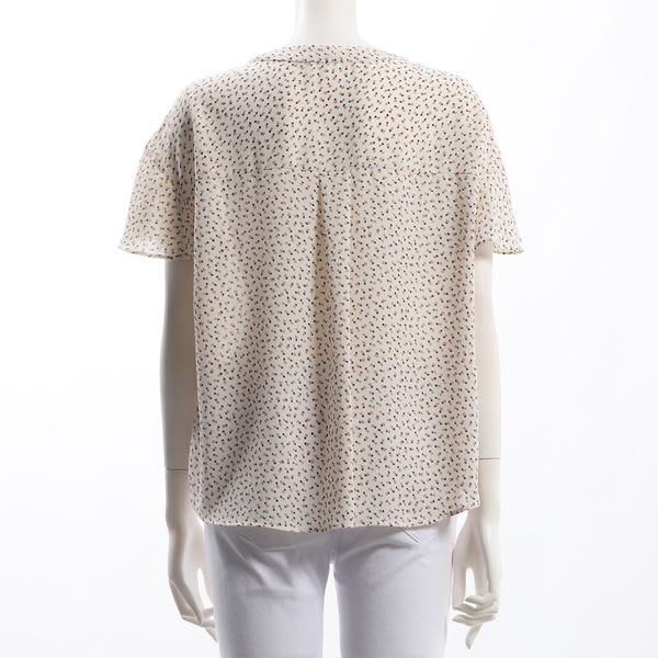 フロントフリルがポイントの総柄ブラウス。テーパードパンツとポインテッドトゥパンプスを合わせて綺麗めなスタイルに、フレアスカートとラウンドパンプスを合わせて女性らしいスタイルも素敵ですよ。