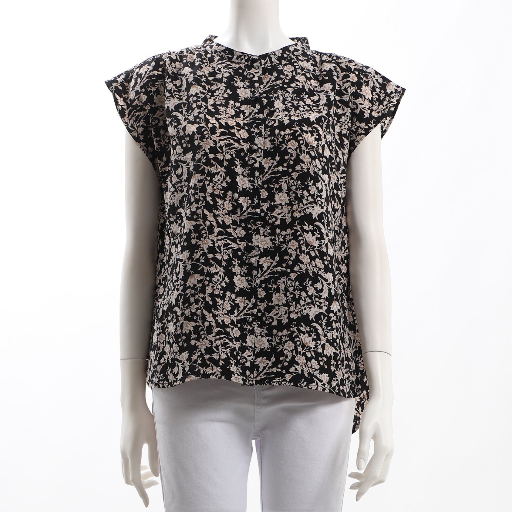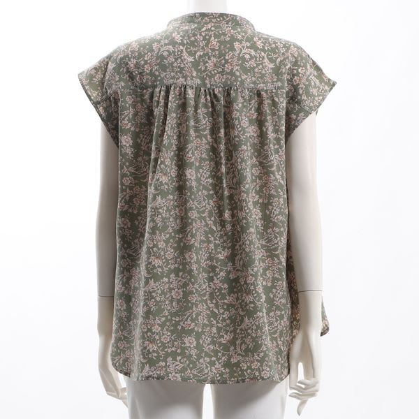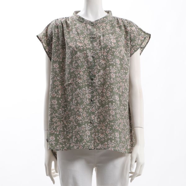 花柄のバンドカラーブラウス。テーパードパンツとポインテッドトゥパンプスを合わせて綺麗めなスタイルに、タイトスカートとラウンドパンプスを合わせて女性らしいスタイルも素敵ですよ。