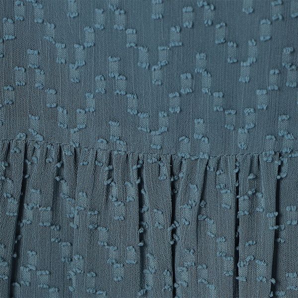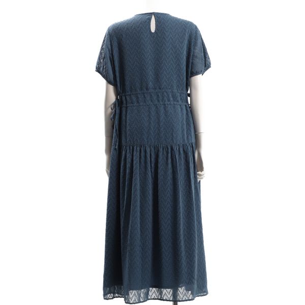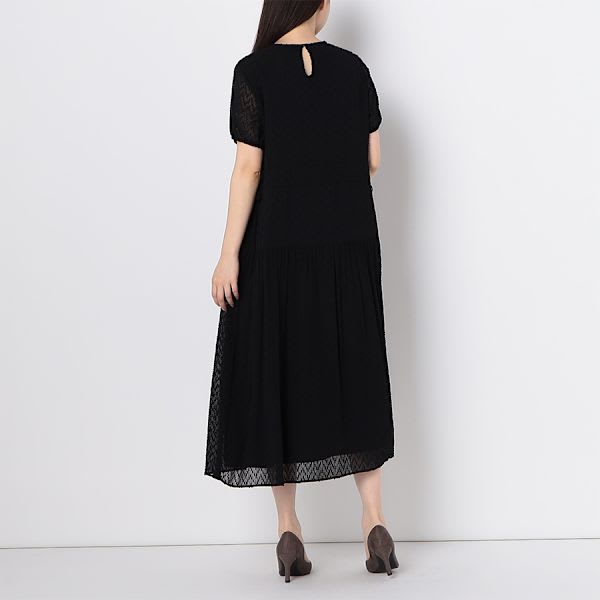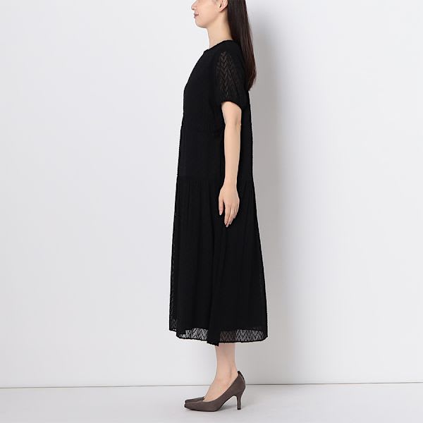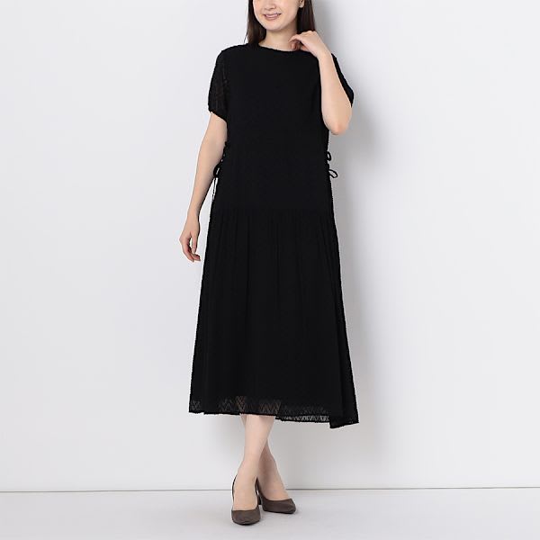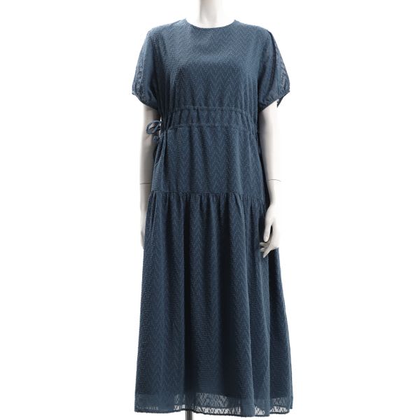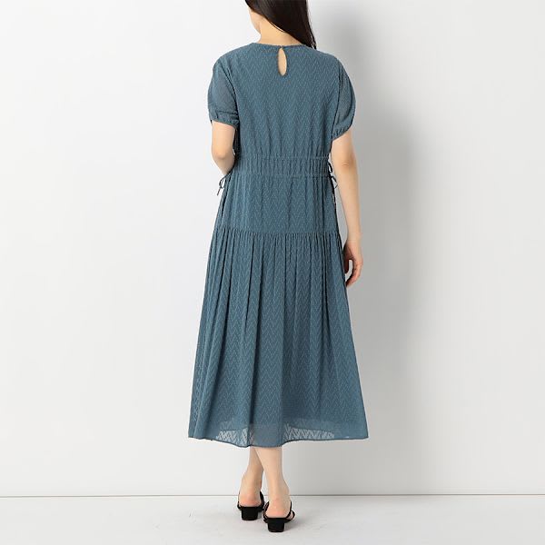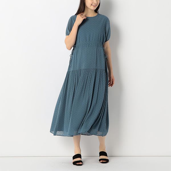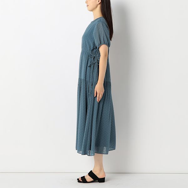 表情のある生地やウエストドロストデザインがポイントのワンピース。小物には、パールイヤリングとパンプスを合わせて上品に、大振りのオーバルイヤリングとバーサンダルでカジュアルにまとめてもいいですね。