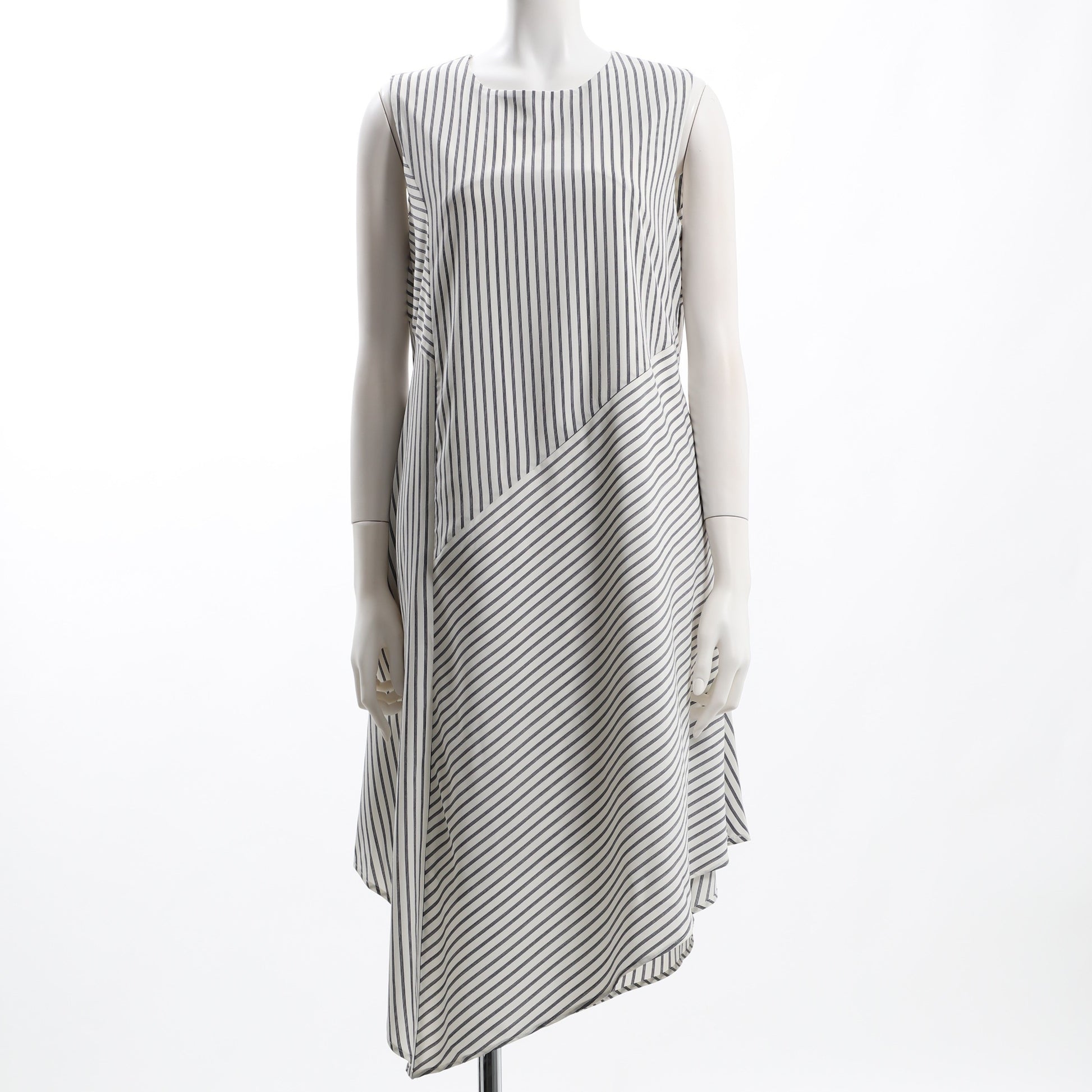 イレギュラーヘムやストライプ切り替えデザインがポイントのワンピースです。ウエストリボンは前後どちらでも結んで頂けますよ。ヒールパンプスを合わせてレディライクな着こなしに、スニーカーを合わせてカジュアルな着こなしもいいですね。