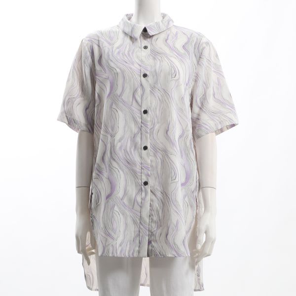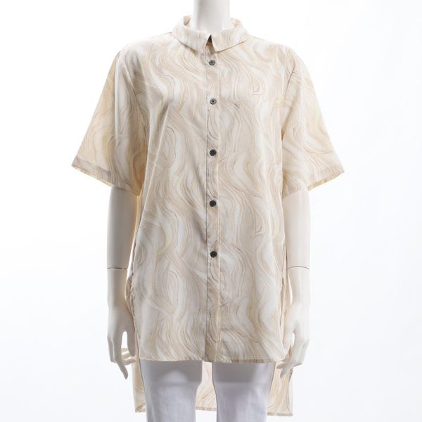 総柄のバックテールシャツ。タイトスカートとヒールパンプスを合わせて綺麗めなスタイルに、デニムパンツとフラットシューズを合わせてカジュアルスタイルもおすすめです。