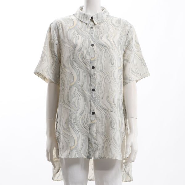 総柄のバックテールシャツ。タイトスカートとヒールパンプスを合わせて綺麗めなスタイルに、デニムパンツとフラットシューズを合わせてカジュアルスタイルもおすすめです。