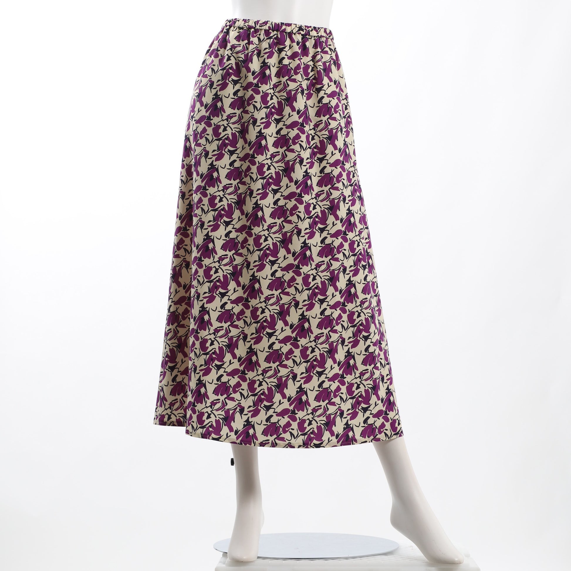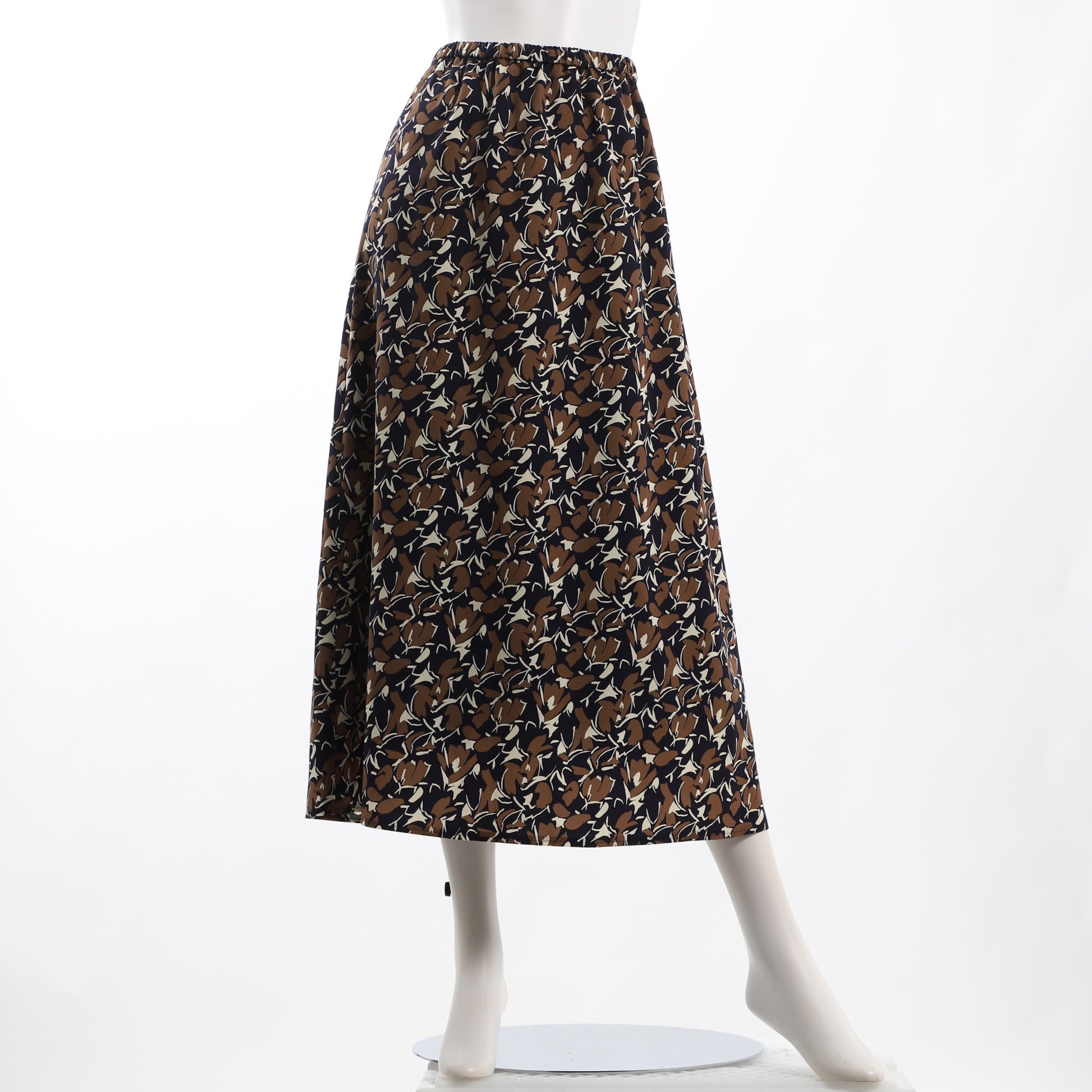 ウエスト総ゴムの総柄フレアスカート。バルーンスリーブブラウスを合わせて女性らしい着こなしに、リブカットソーを合わせてかっこよく着こなすのも素敵です。
