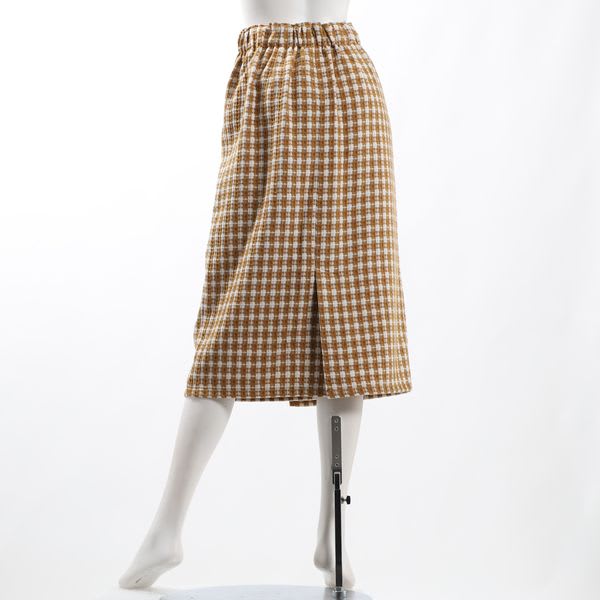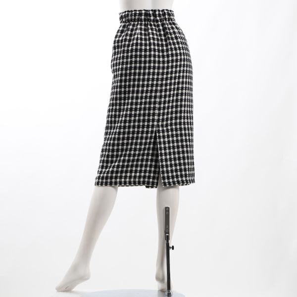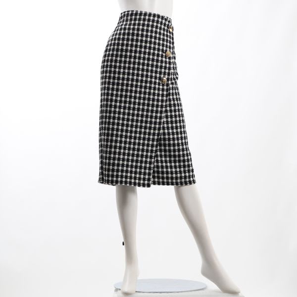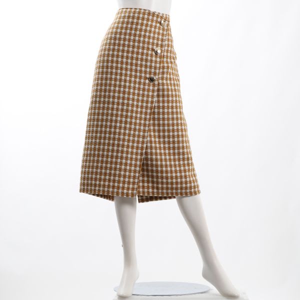 ツイードのラップ風タイトスカートです。リブニットとパンプスを合わせてきれいめに、ローゲージのニットとスニーカーを合わせてカジュアルに仕上げても良いですね。