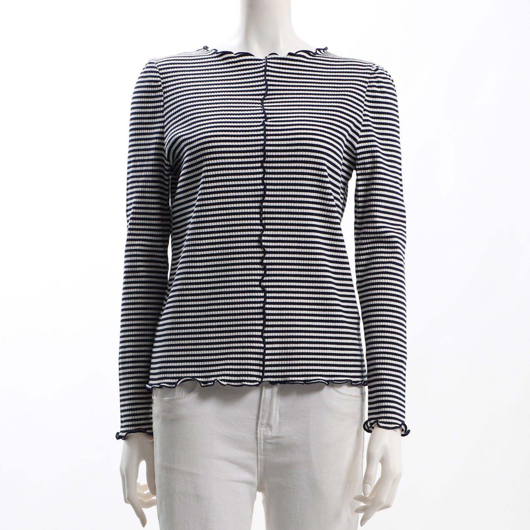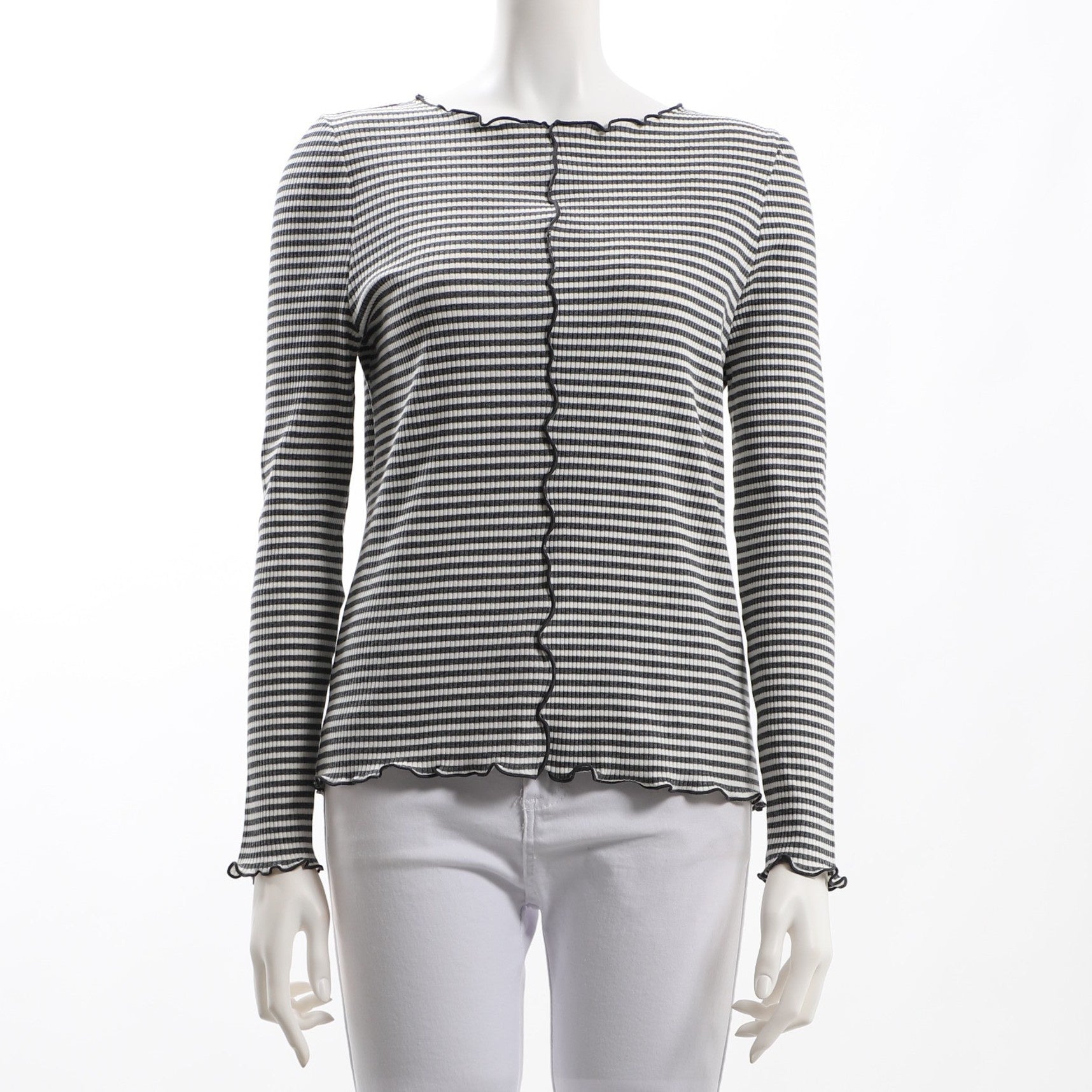 ボーダー柄のメロウフリルカットソー。フレアスカートとラウンドパンプスを合わせて女性らしいスタイルに、デニムパンツとスニーカーを合わせてカジュアルスタイルもおすすめです。