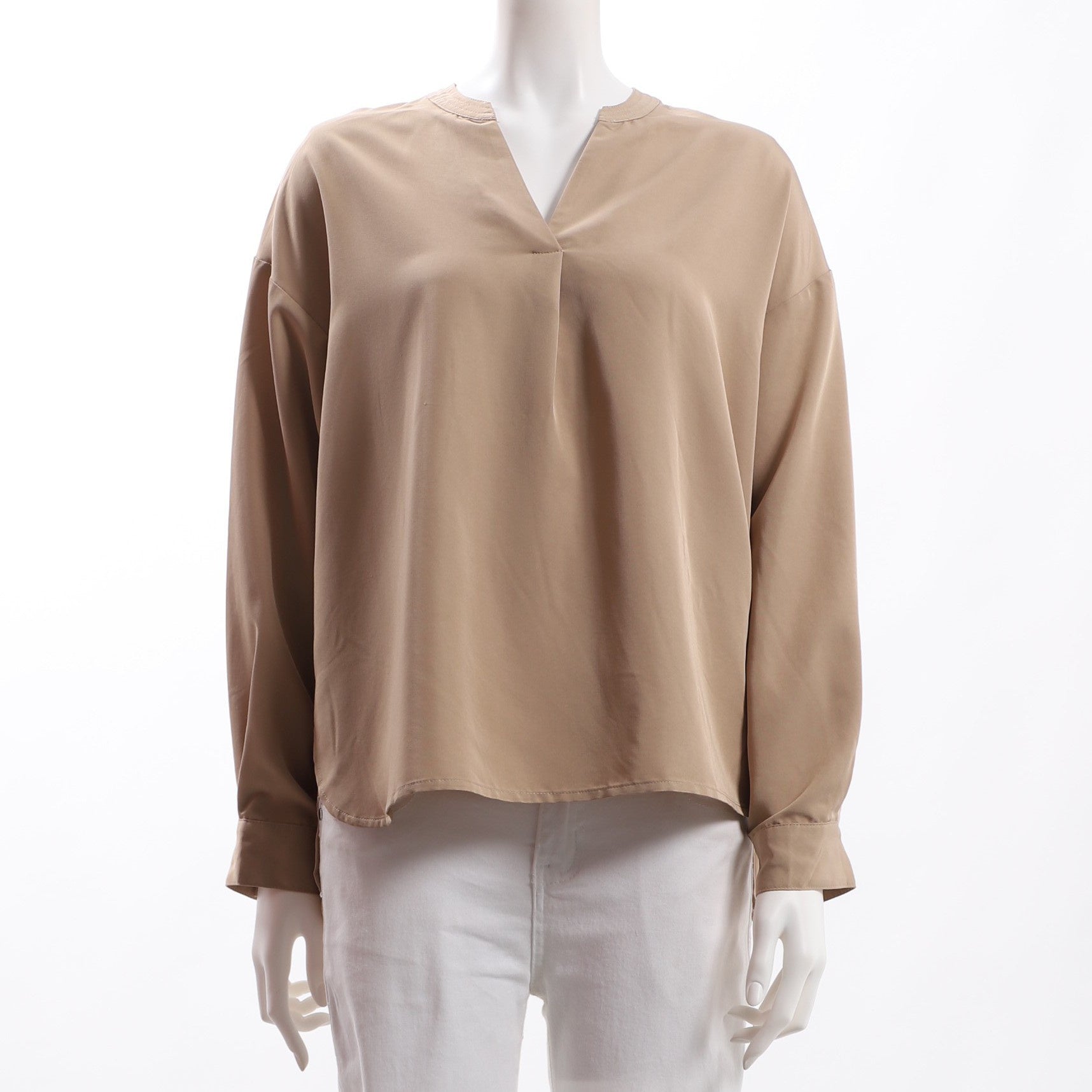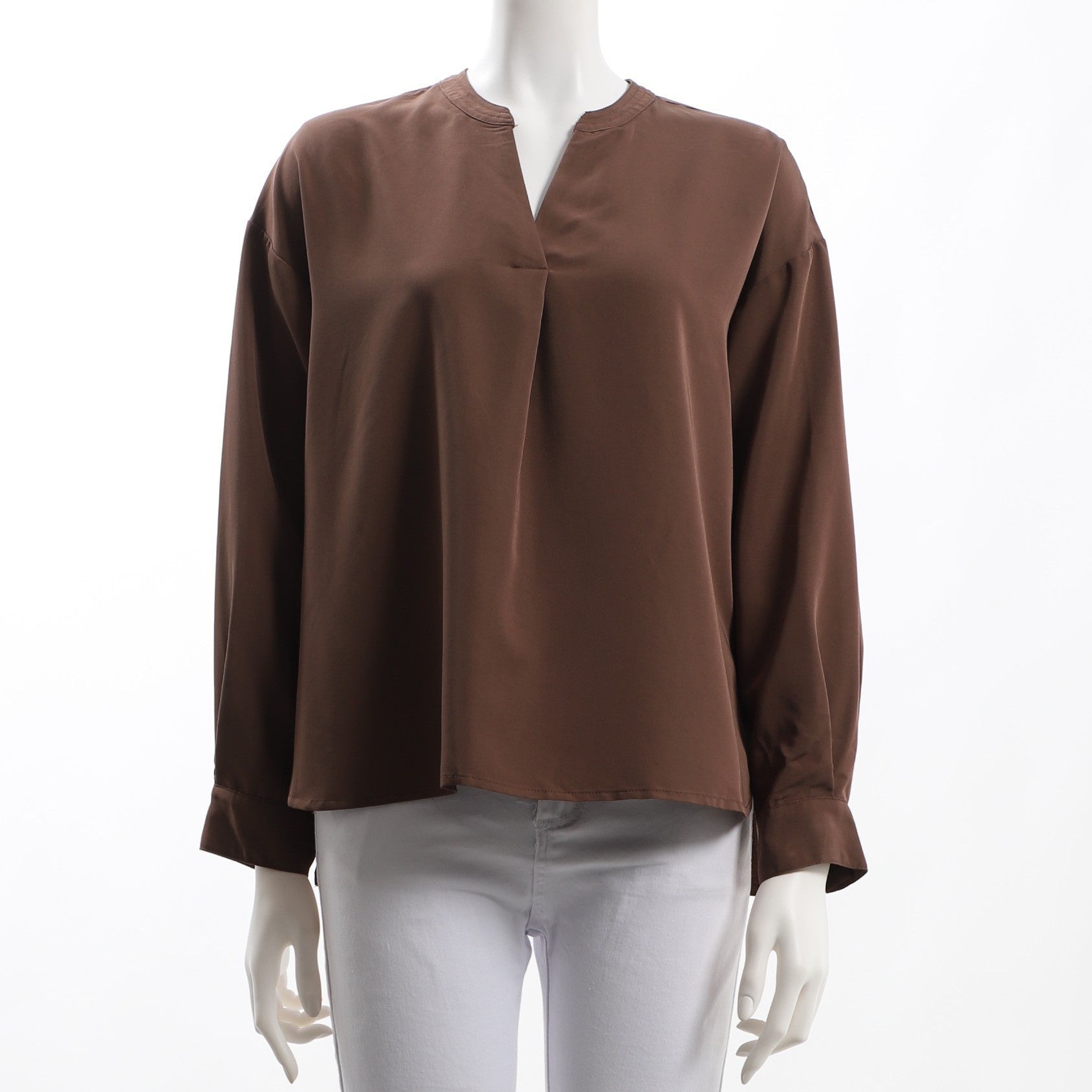 ドロップショルダーデザインのオープンフロントネックブラウスです。