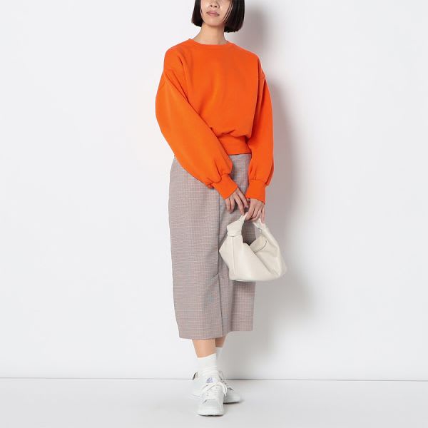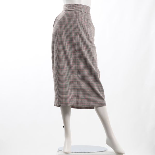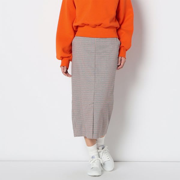 フロントスリット入りのチェック柄タイトスカート。トップスにはスキッパーシャツを合わせて辛めにも、ギャザーネックのとろみブラウスで甘めにまとめてもいいですね。