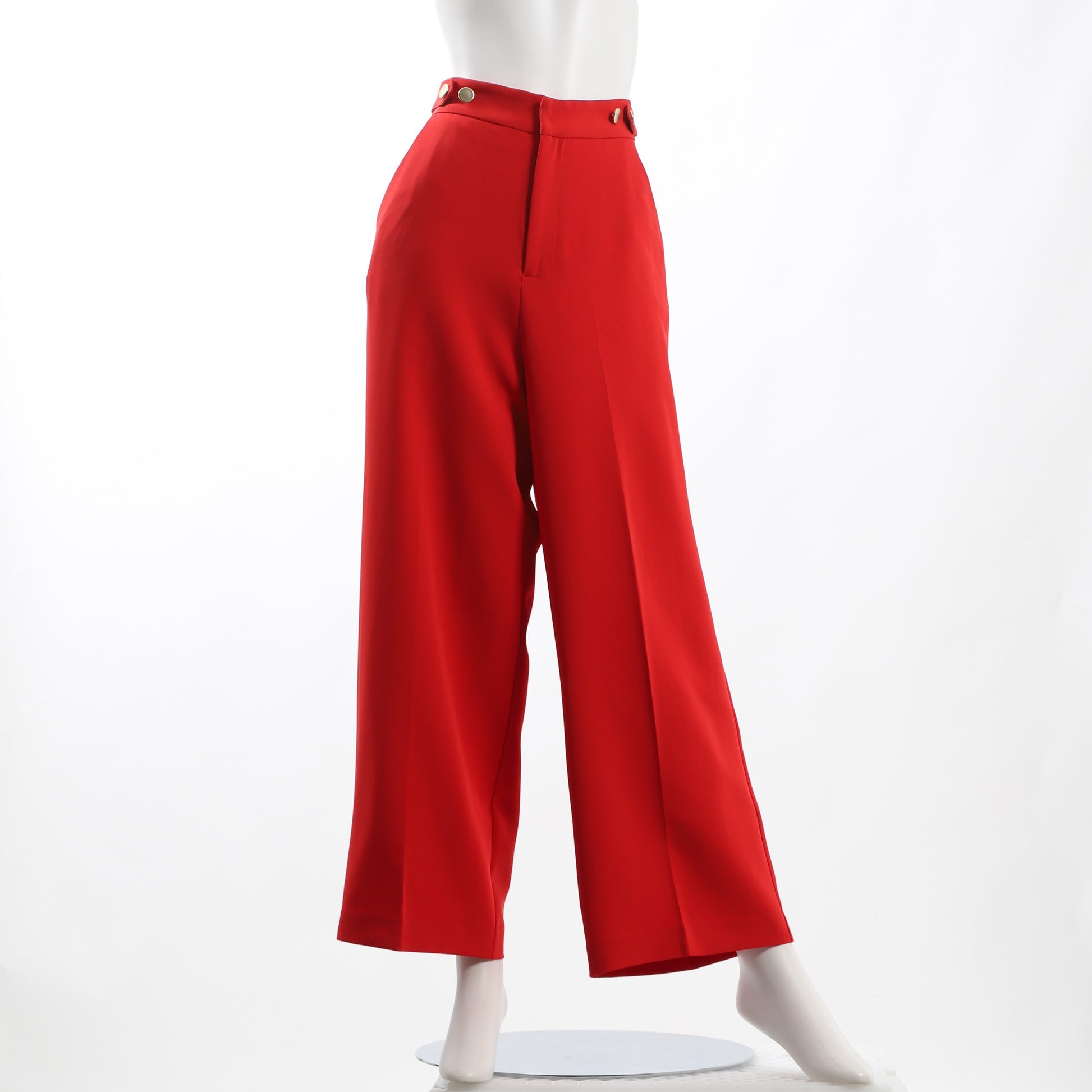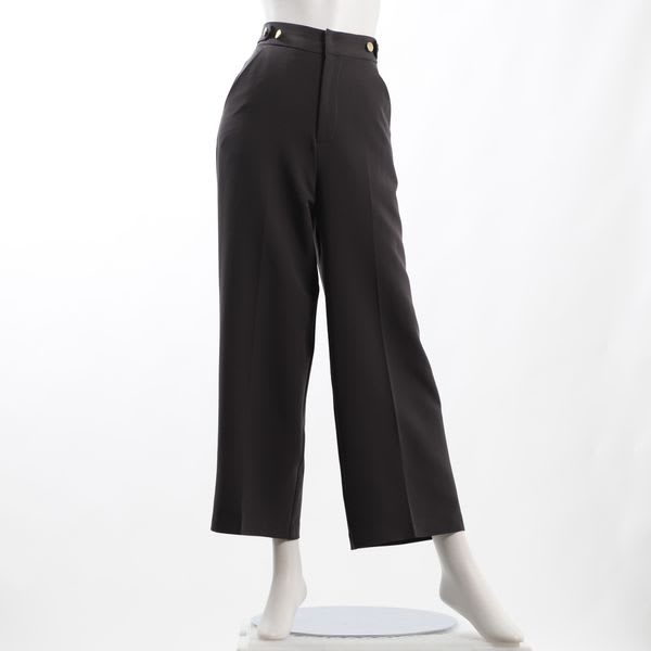 サイドのメタルボタンがポイントのワイドパンツ。スタンドカラーブラウスとパンプスでキレイめに、シャツとポインテッドトゥパンプスでスマートにまとめてもいいですね。