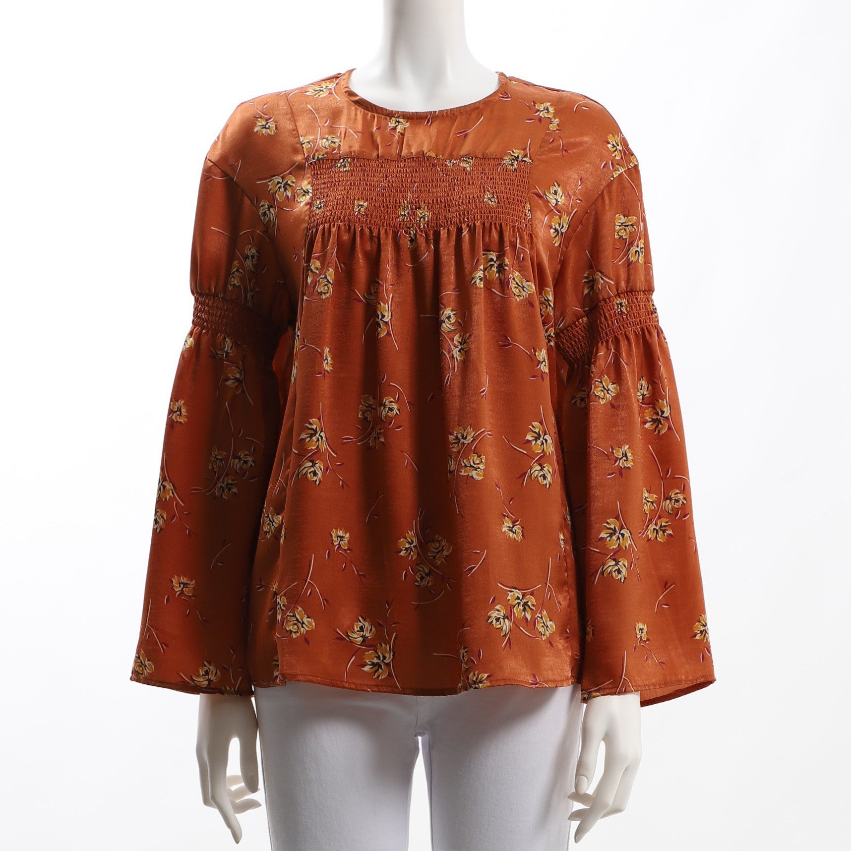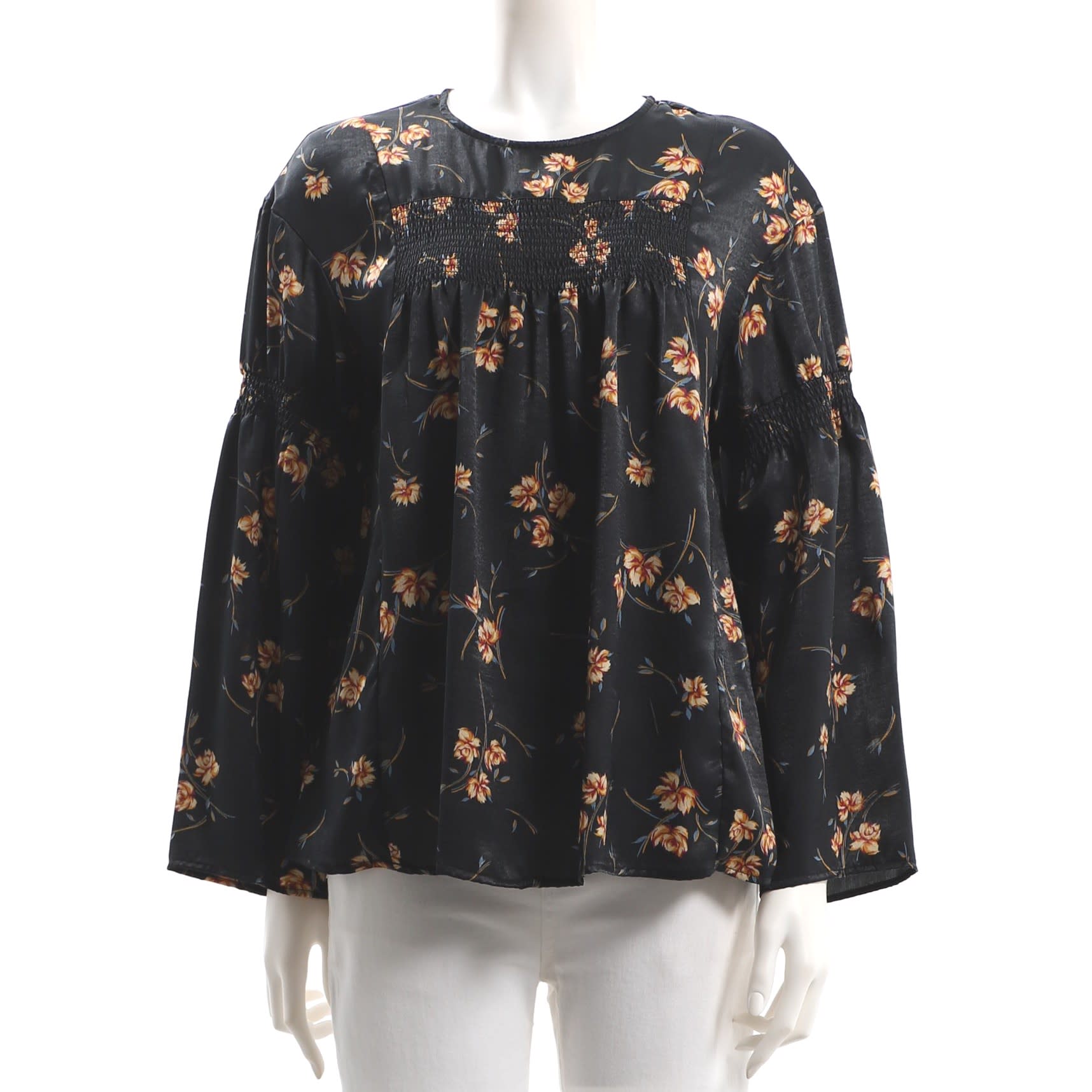 シャーリングデザインがポイントの花柄ブラウスです。タイトスカートとパンプスを合わせてレディライクに、テーパードパンツとローファーを合わせてクールめに着こなしても良いですね。