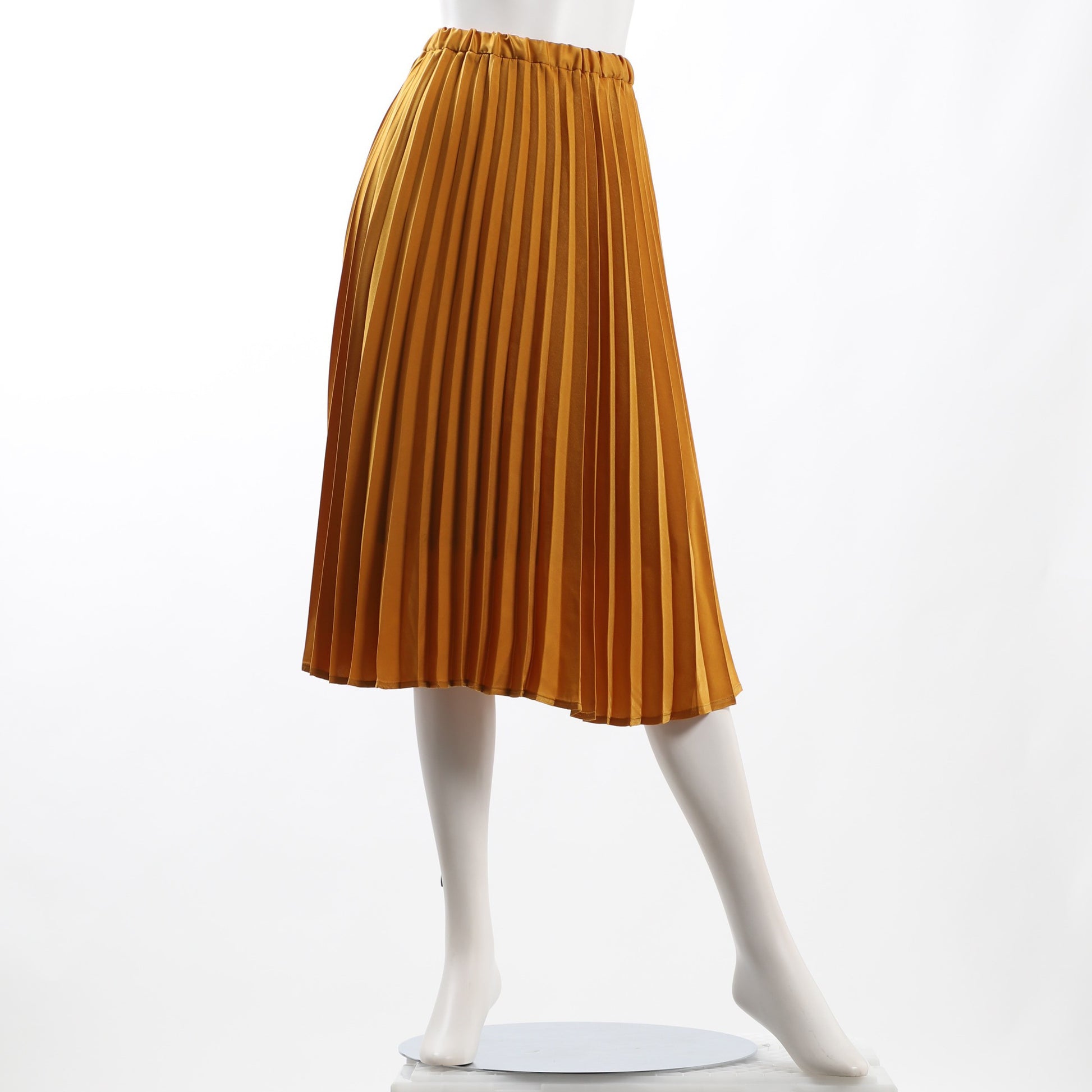 光沢素材を使ったプリーツスカート。スタンドカラーのとろみブラウスとパンプスを合わせて女性らしく、カットソーとスニーカーでカジュアルにまとめてもいいですね。
