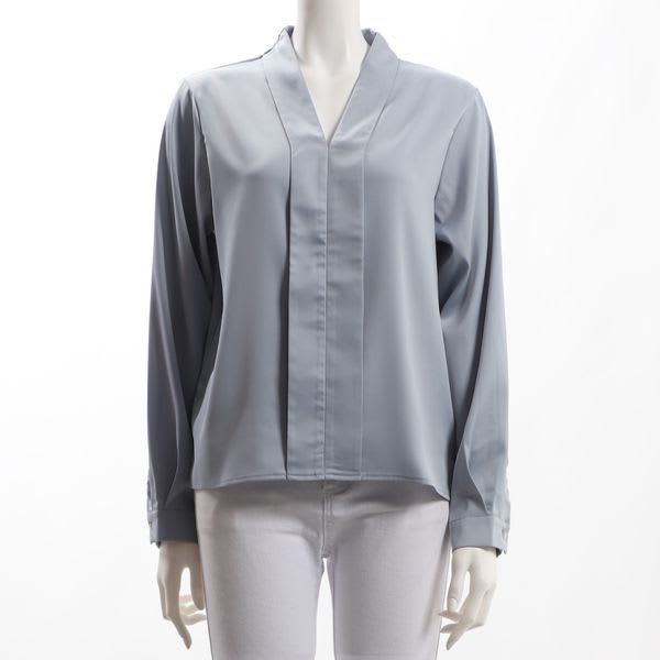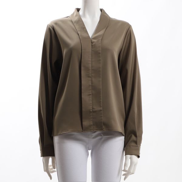 前立てがポイントのVネックブラウスです。タイトスカートとラウンドトゥパンプスを合わせて女性らしい着こなしや、センタープレスパンツとビットローファーを合わせたマニッシュな着こなしも素敵ですよ。
