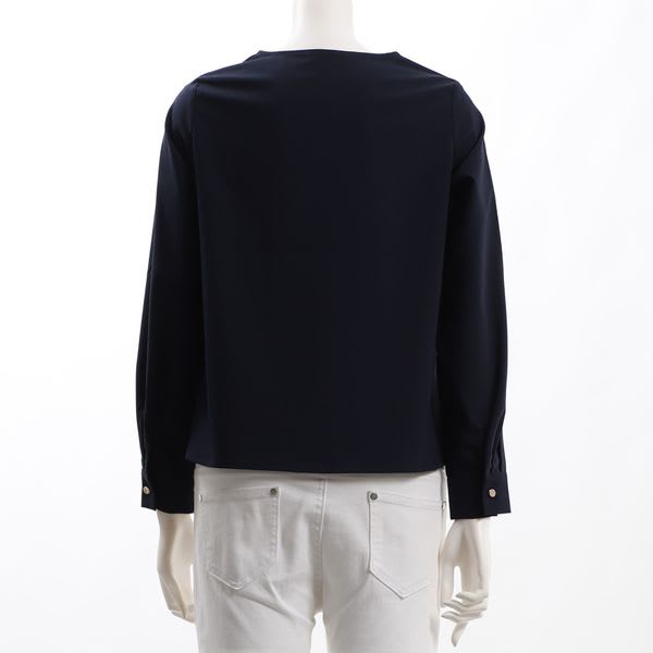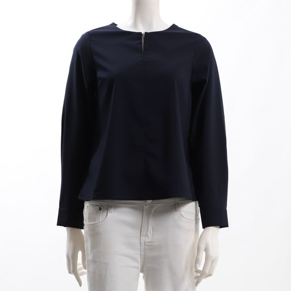ネックラインのメタルパーツがポイントのブラウス。ボトムスにはフレアスカートを合わせてフェミニンに、テーパードパンツでスタイリッシュな雰囲気をプラスしてもいいですね。