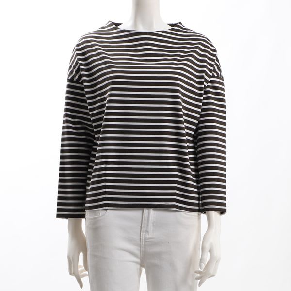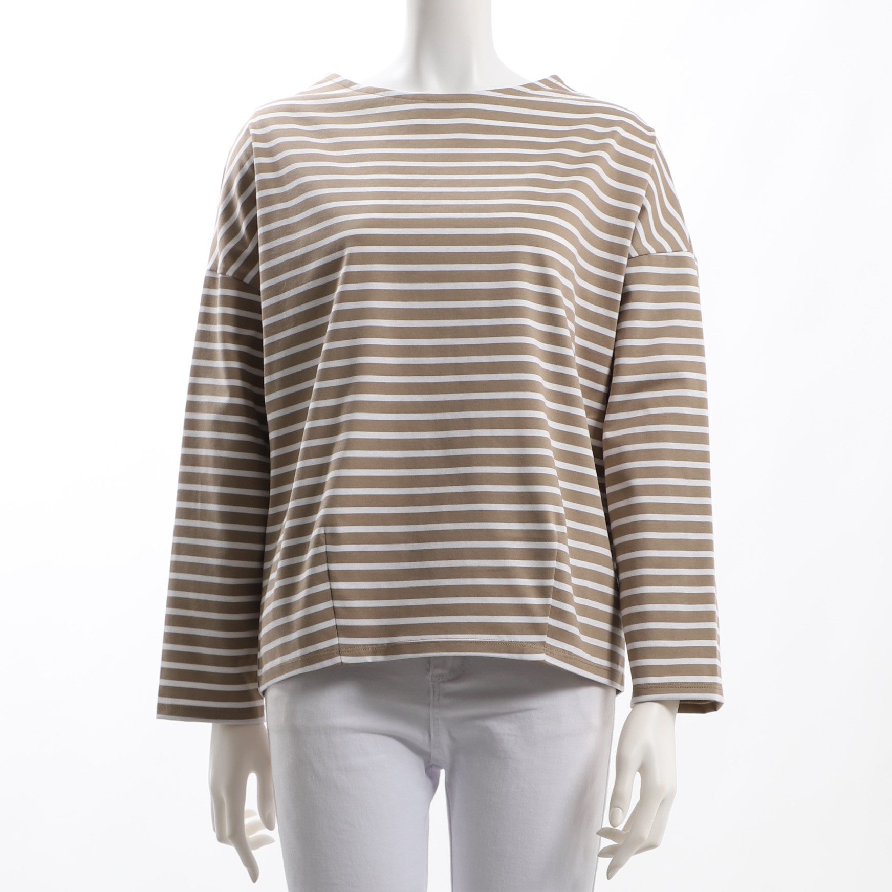 オフネックのボーダー柄カットソー。ボトムスにはデニムパンツを合わせてカジュアルに、ペンシルスカートで女性らしさをプラスしても素敵です。
