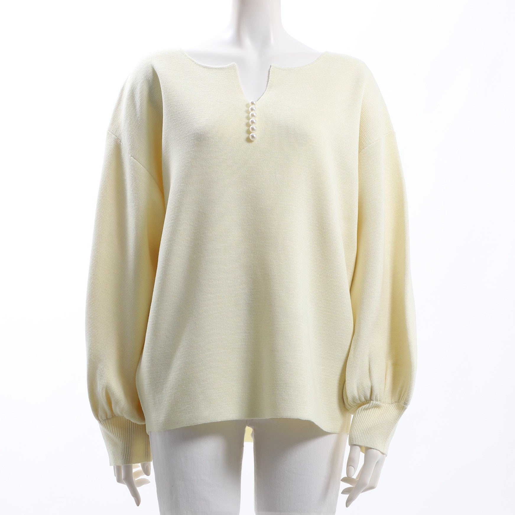 襟元に連なったパールがポイントのオープンフロントネックニット。タイトスカートを合わせてレディライクな着こなしに、デニムパンツを合わせてラフに着こなすのもいいですね。