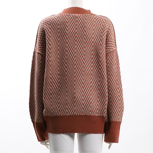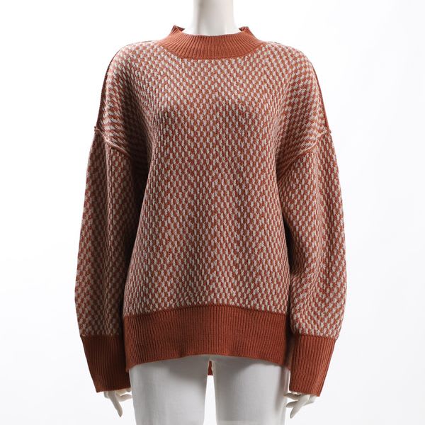 デザイン編みのドロップショルダーニットです。テーパードパンツを合わせてきれいめに、デニムスカートを合わせてカジュアルに着こなしても良いですね。