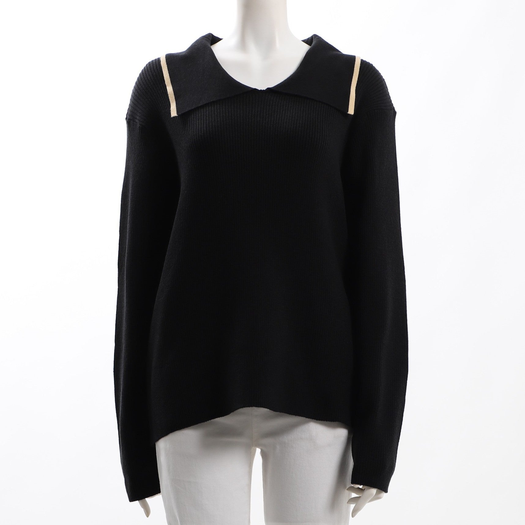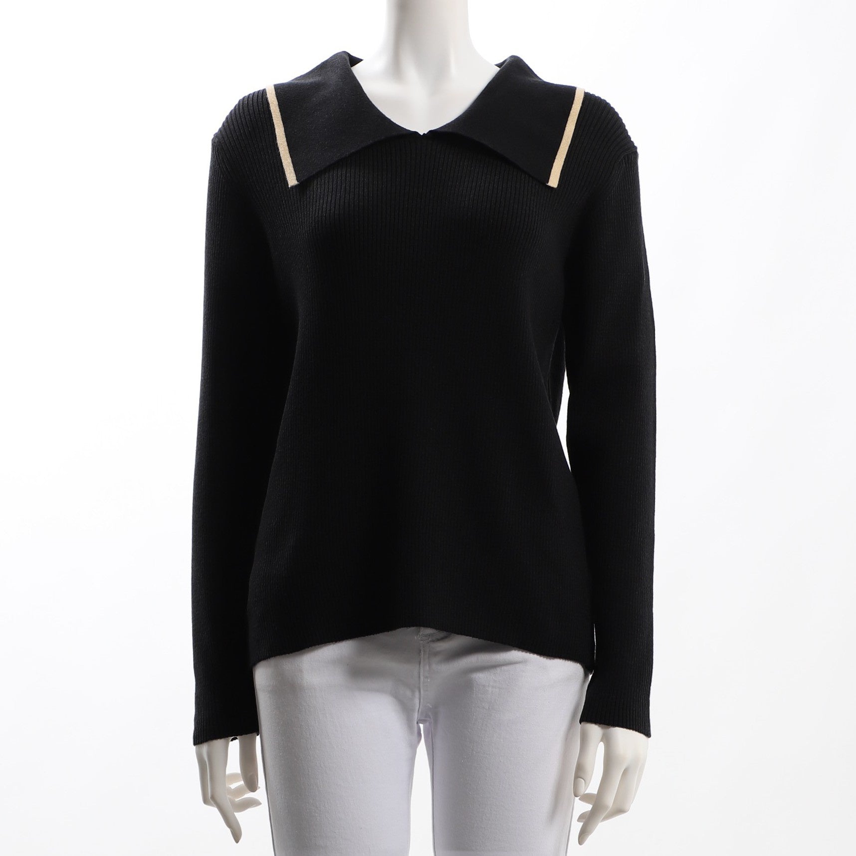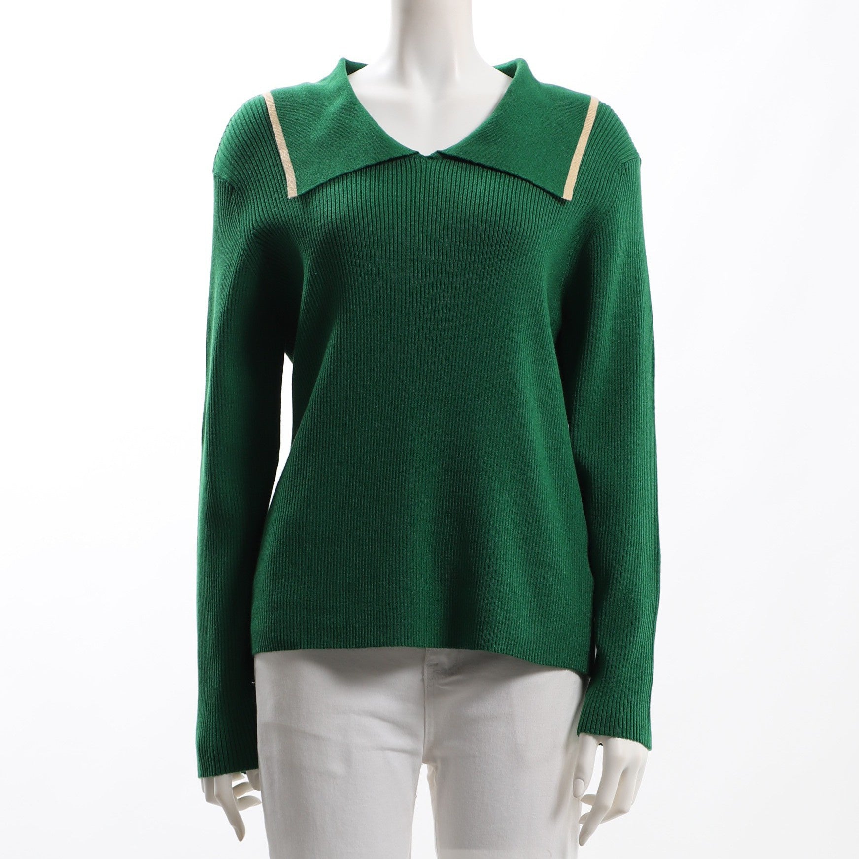 バイカラーデザインの襟がポイントのリブニットです。フレアスカートにパンプスを合わせてきれいめに、デニムパンツにスニーカーを合わせてカジュアルに着こなしても良いですね。